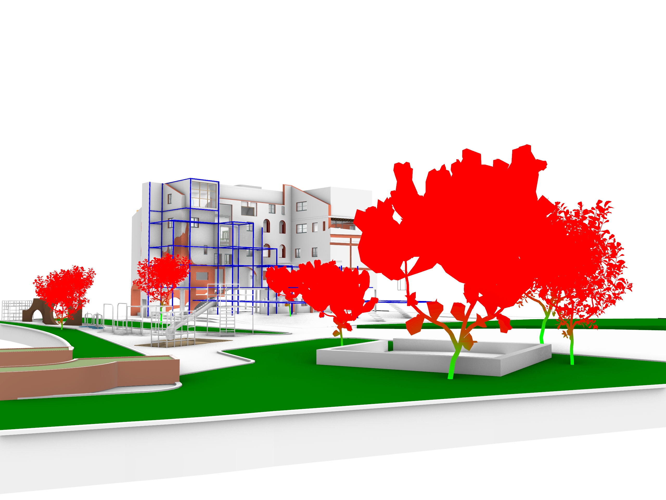 exterior shot re used materials on the building the orange spots are bricks the white facade extured wall plaster red are trees and the green spots are grass