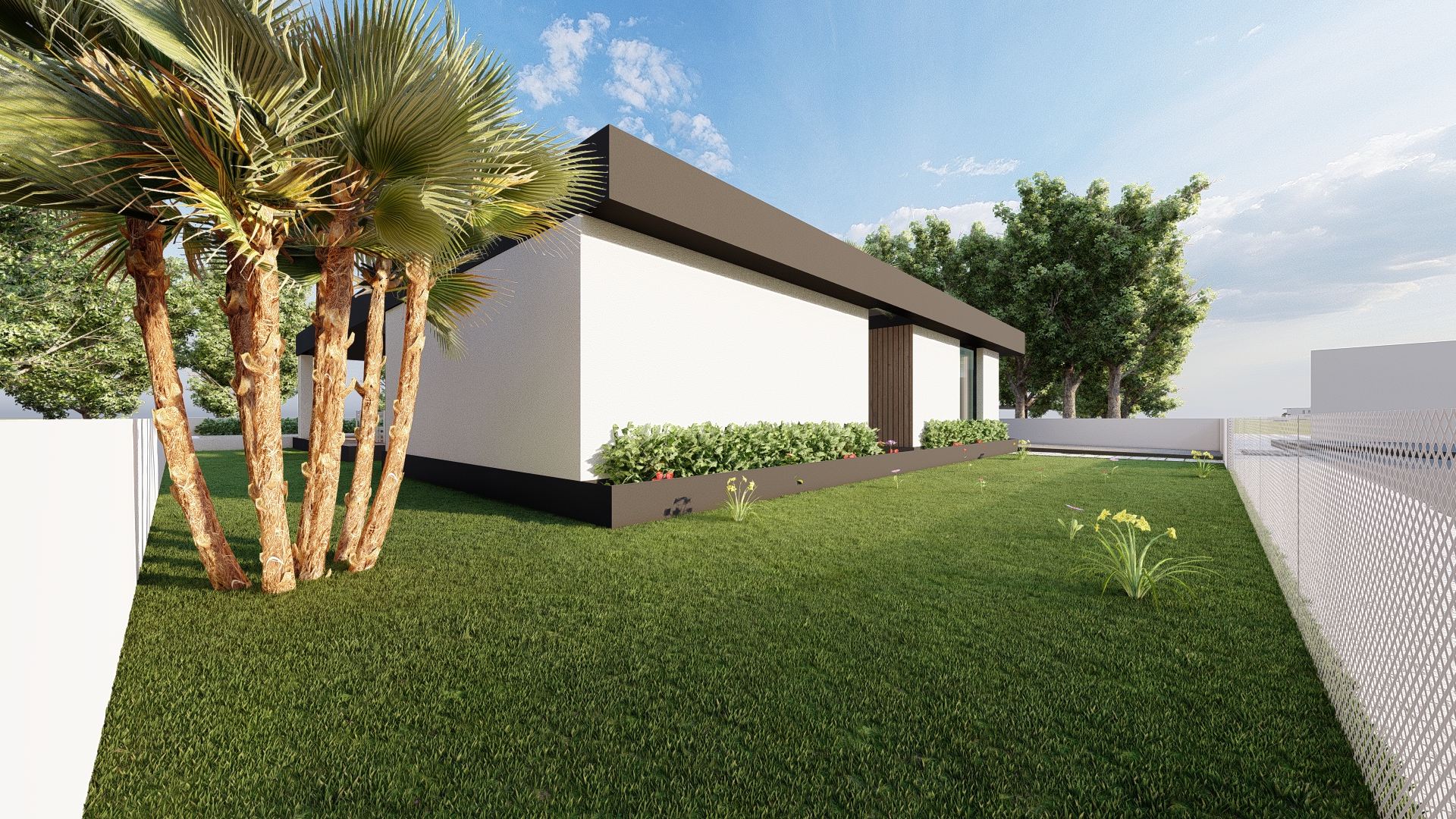 cena exterior realista ilumina o natural sol brilhando de fim da tarde coroamento da cobertura em cor preta com uma textura lisa fachada a cor branco com textura de gesso