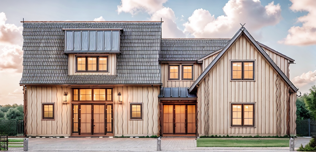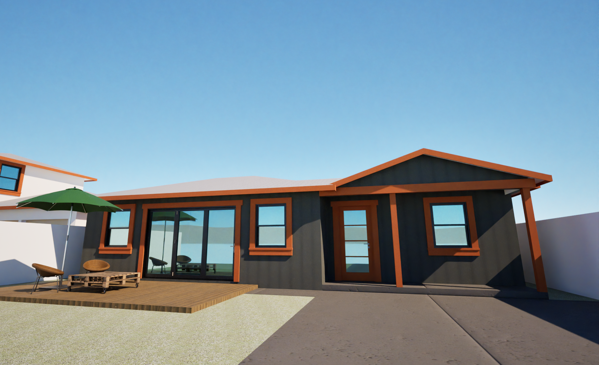 scandinavian style bungalow with cedar wood window and door trims on a sunrise california weather and native california landscape with wall sconce lights at doors lights coming out of windows and doors