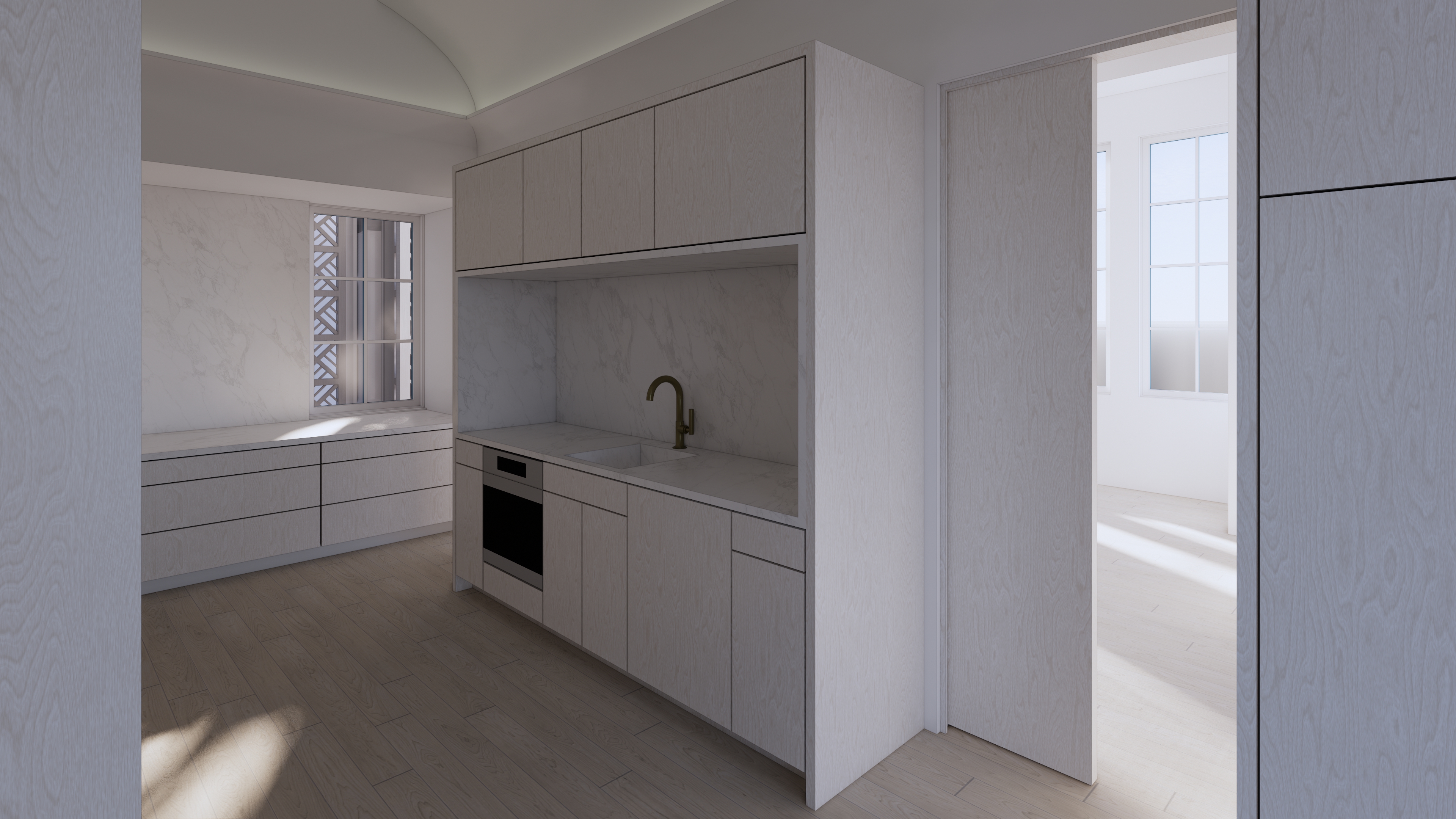 make this look like a high end butler s pantry with white oak natural stain and venetian plaster walls and ceiling add high end decor to the space as one would find in a highly stylized butler s pantry but so that the owner feels like it will be a lovely space to be in add dainty cabinetry knobs centered on each drawer and cabinet the room beyond will be an office but leave it empty for now the wall next to the window will have marble and no art on it