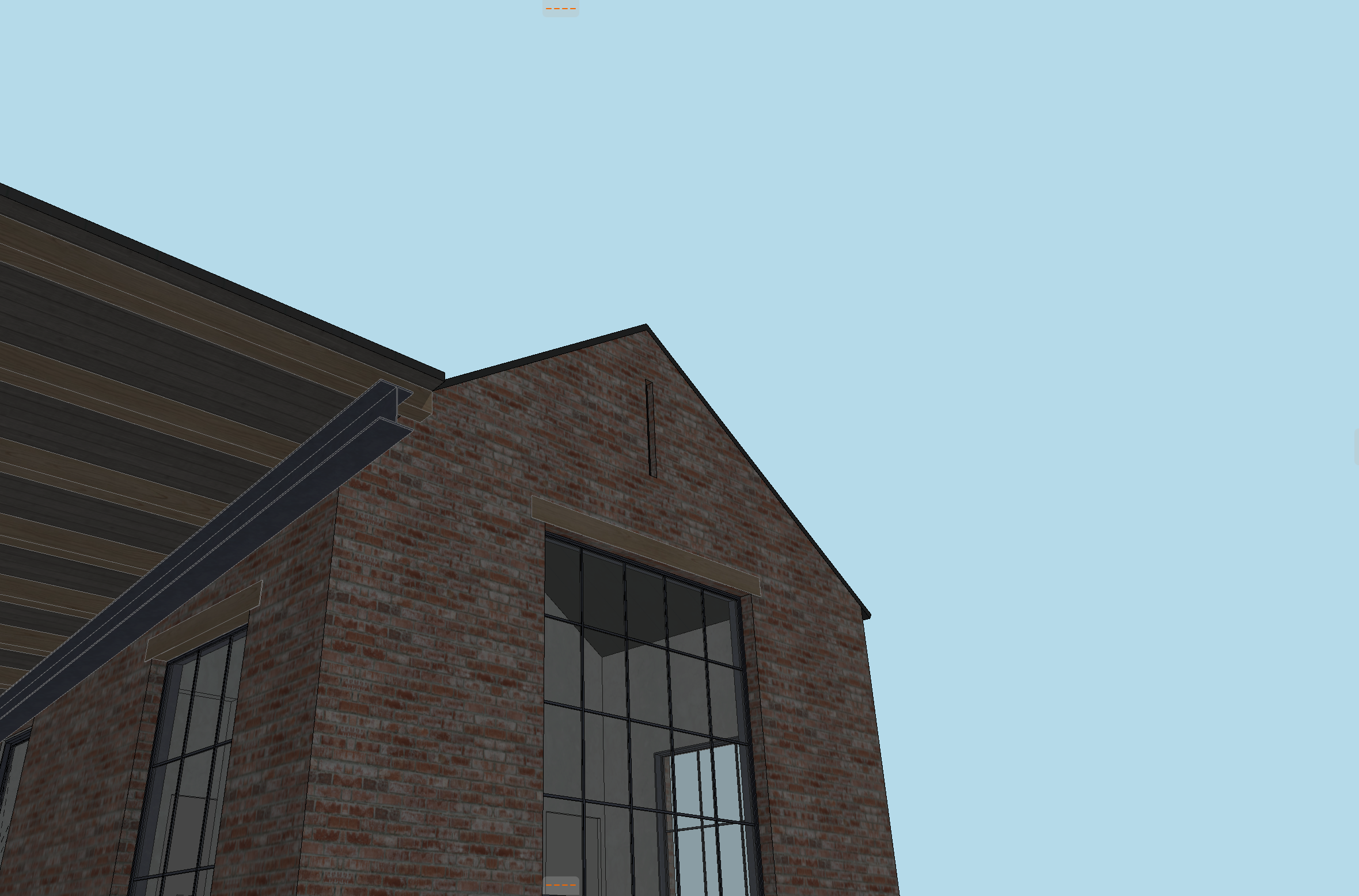 detail shot of an antique brick house with a soldier course at the top of brick walls with timber columns steel beams reclaimed pine soffit yellow pine trees in the background clouds in the sky