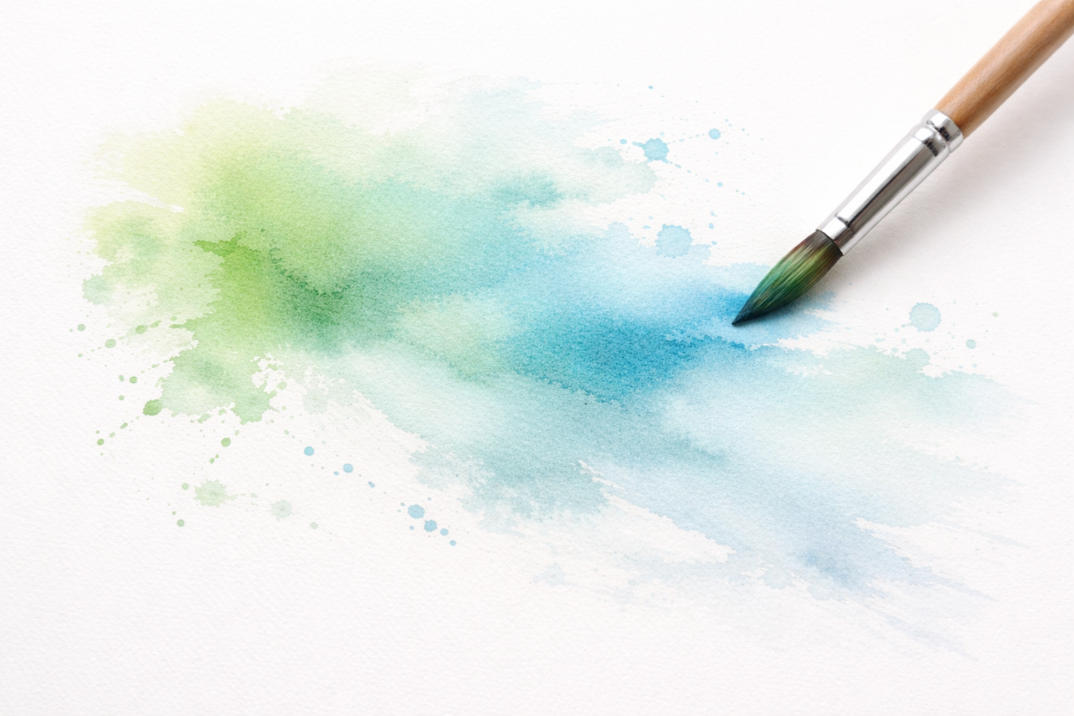 generate an image of a black painbrush painting some dark greens and indigo blue watercolour onto some white paper make the colours a lot more punchy and the image much mroe architectural and contained so i can use in the corner of a white page