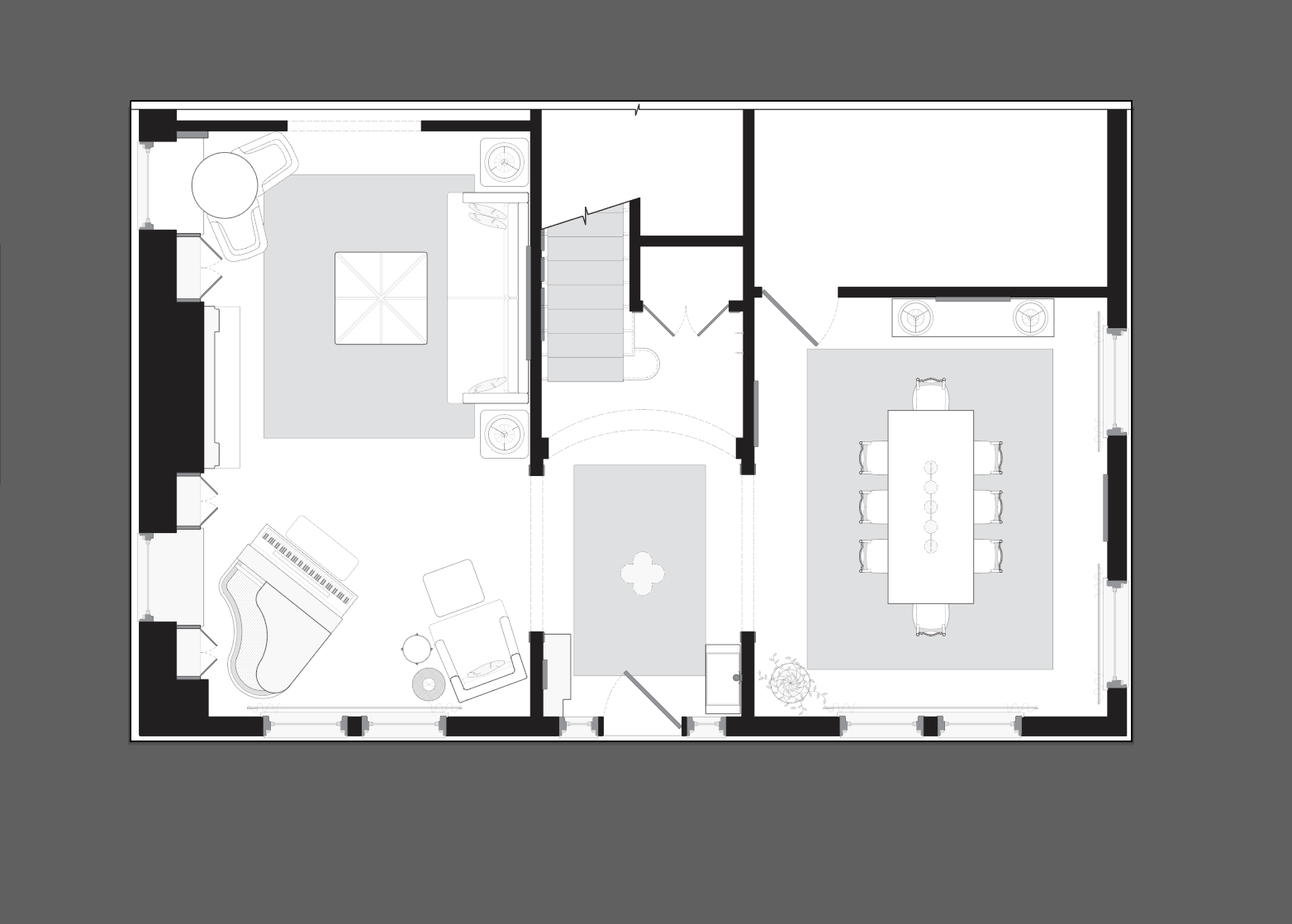 interior shot make this look like a monocromatic rendering with shading of furniture shown in the floor plan