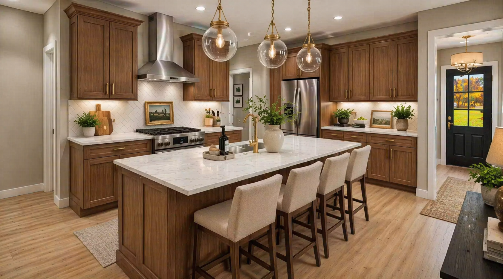 make the front door a quarter lite door instead of half lite change the foyer light fixture to progress inspire drum shade match the cabinets to brno aveline hazelnut style and color update the countertops to cresent quartz acadia gold