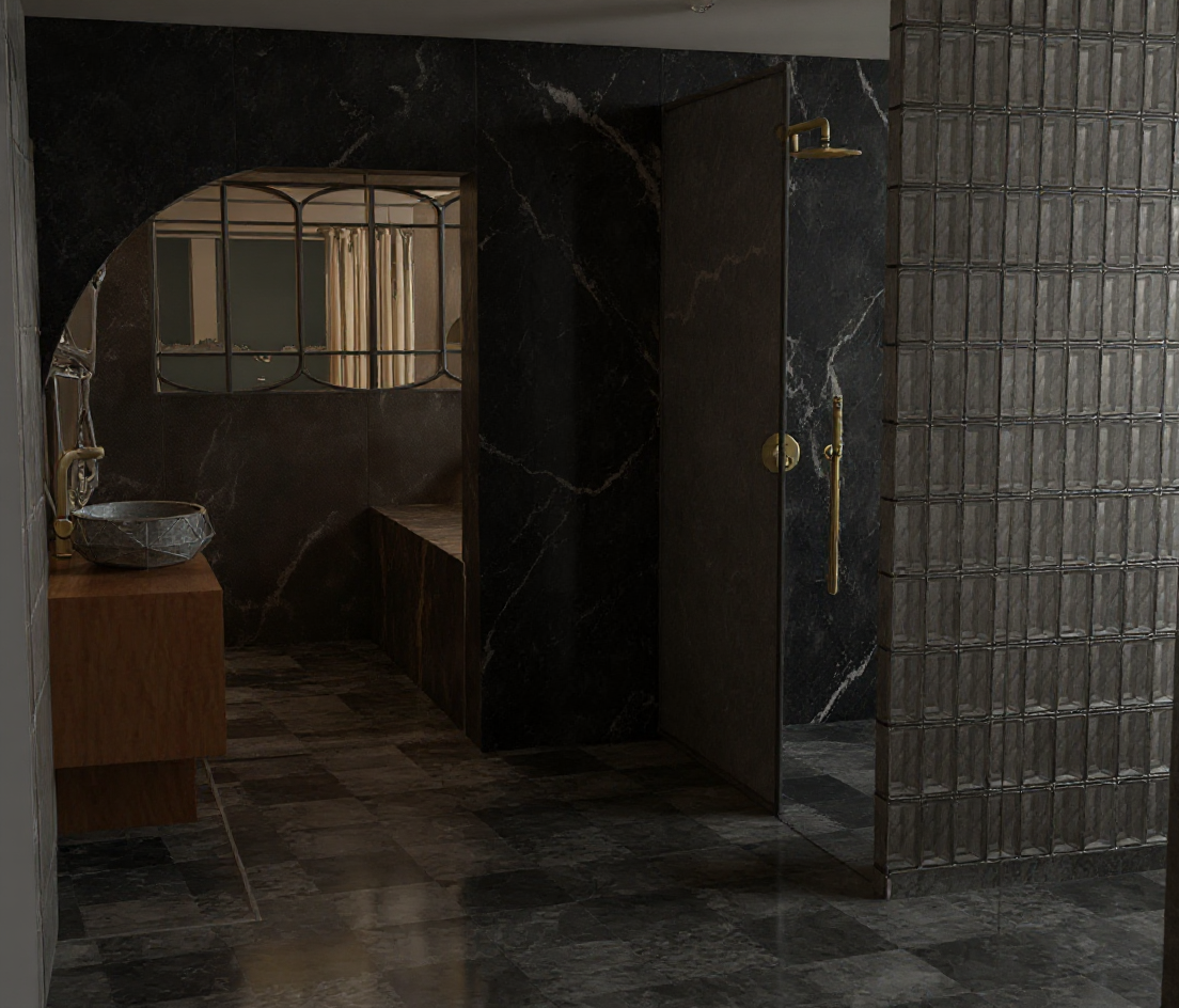marbre noir et jaune dor pav de verre gris meuble en bois vasque en pierre verri re art d co sur salon plafond spots robinet dor romantique sombre