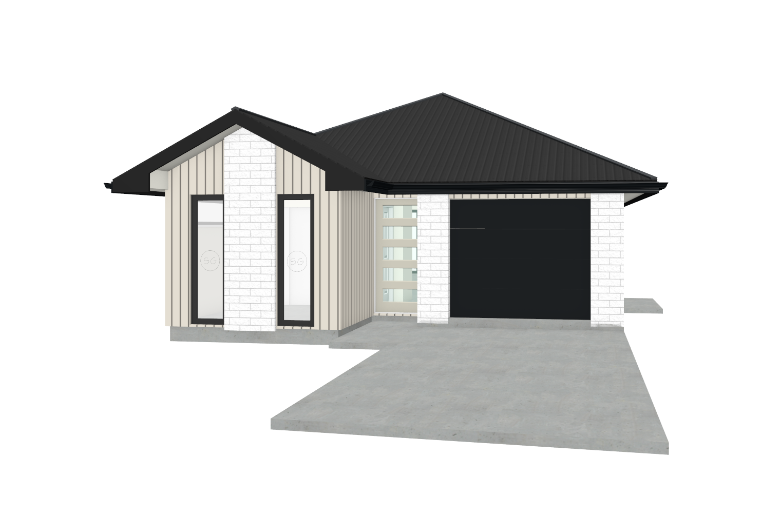 white brick black wood with a driveway and fencing short grass