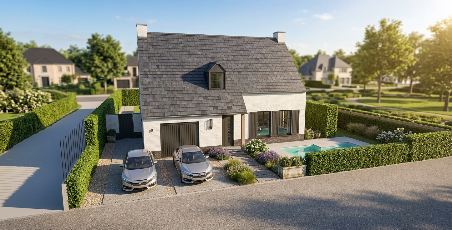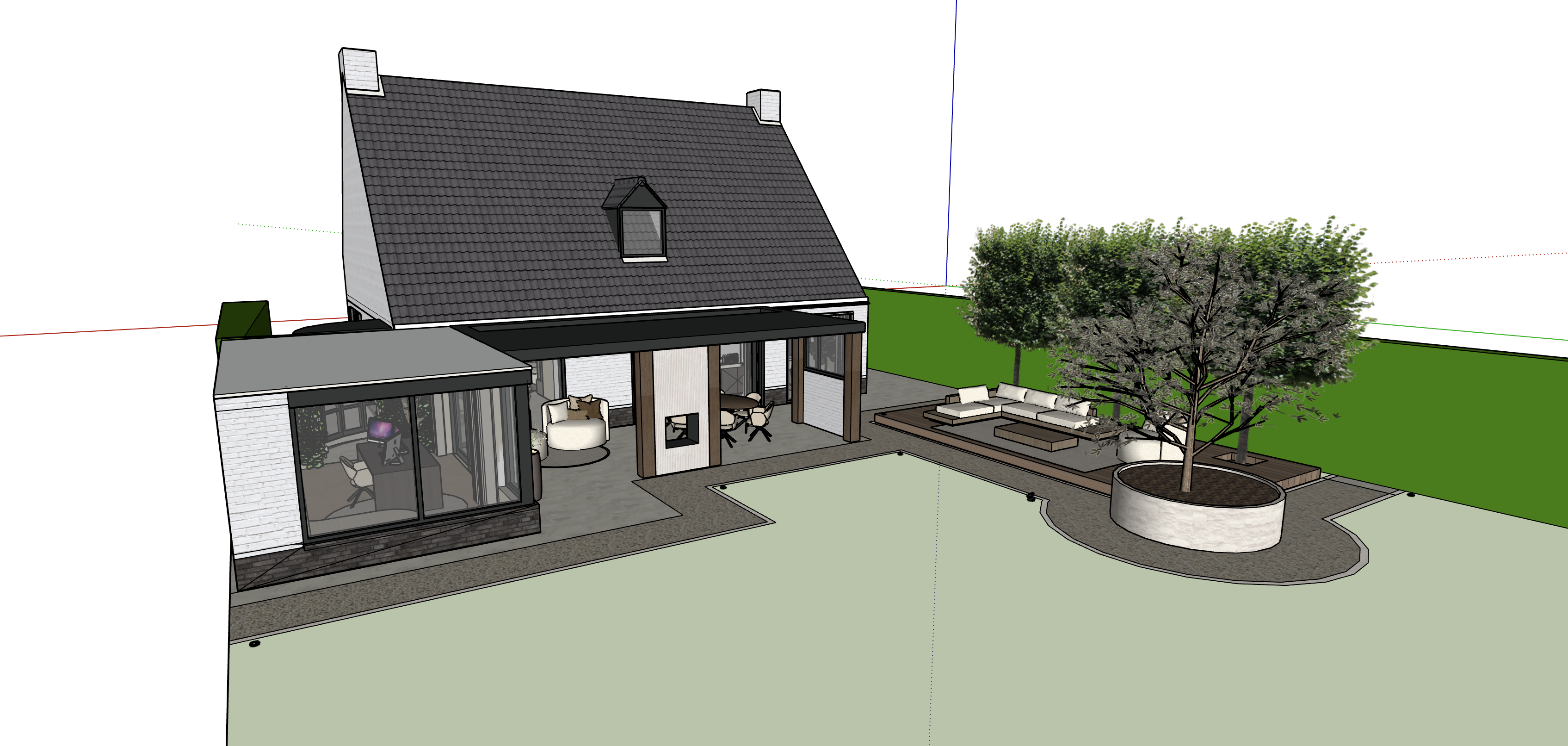 can you make this photorealistic put a fence or hedge around it and please include surroundings as well and make it a bit of a nice garden and outside it is just light and the sun is shining