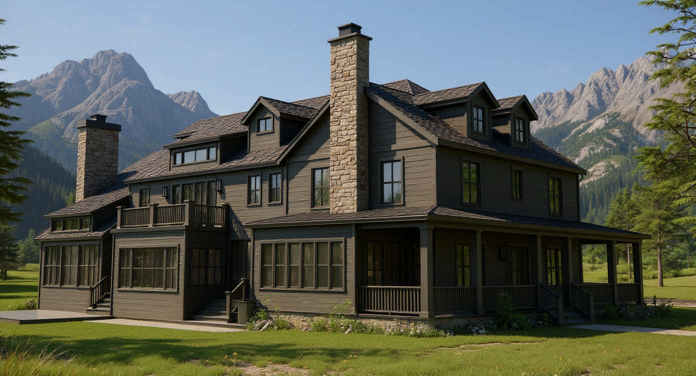 a rustic two story wooden house with a warm honey toned exterior the roof and trim are a rich chocolate brown sunlight bathes the scene in a soft golden glow creating a serene and inviting atmosphere surrounding the house lush green grass and scattered wildflowers add vibrant touches of yellow and white tall pine trees with deep green foliage frame the background under a bright blue sky with fluffy white clouds the overall mood is peaceful and idyllic akin to a quiet countryside retreat