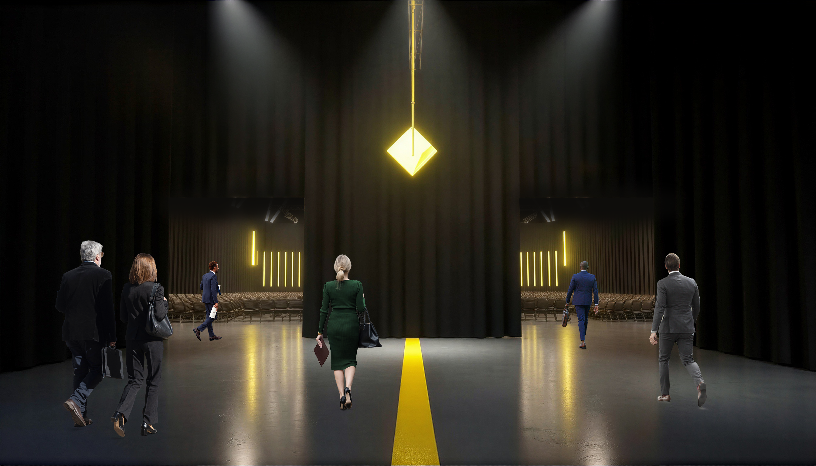 create an elegant and modern exhibition hall with a minimalist stage the atmosphere should be sleek and professional use deep black curtains as the backdrop with a vibrant yellow geometric pendant light hanging prominently at the center the floor is a light gray hardwood warm and inviting the left and right sides of the stage have recessed areas with sophisticated seating arrangements dark gray in color and illuminated by slender vertical yellow lights the ceiling features sleek industrial trusses with subtle spotlights the overall mood is contemporary and stylish with a hint of vibrant energy from the yellow accents