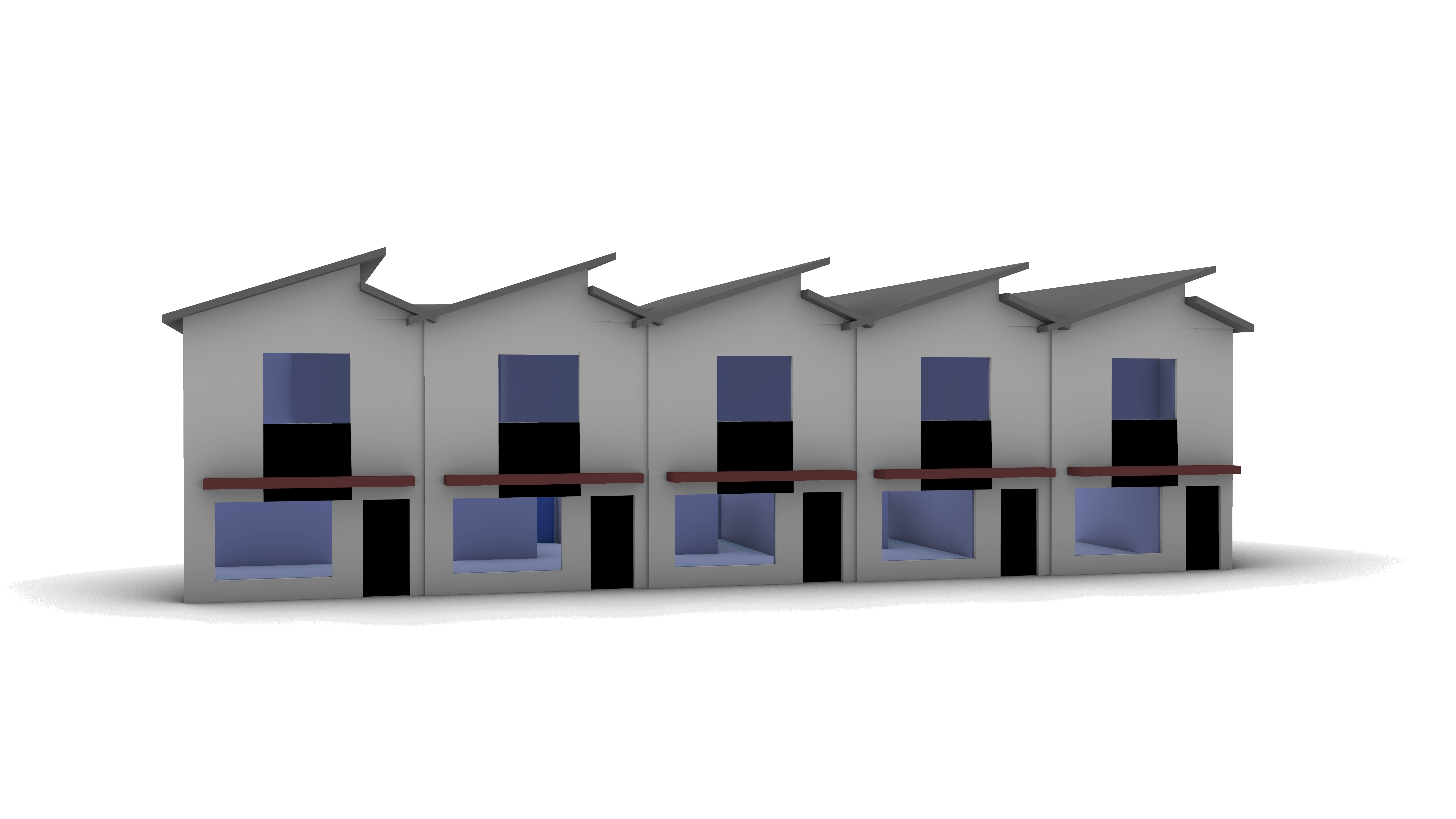 render this townhome building in a west coast modern style keeping all existing geometry and proportions exactly as shown use a refined material palette featuring dark metal panels smooth fiber cement or stucco in warm grey tones and moderate accents of natural wood such as vertical cedar cladding or soffit details to introduce warmth and texture each vertical roof segment should appear as a distinct unit by subtly varying material combinations alternating between darker metal lighter grey panels and wood tones to emphasize rhythm and individuality include black framed windows clean modern detailing and restrained trim consistent with contemporary design in front of each unit include a 3 m private amenity space defined by a modern front pathway and small landscaped area with concrete or paver surfaces low plantings and optional privacy elements like planters or short screens the overall landscape should remain minimalist and cohesive reinforcing the west coast modern character use soft natural daylight to highlight material texture depth and shadow