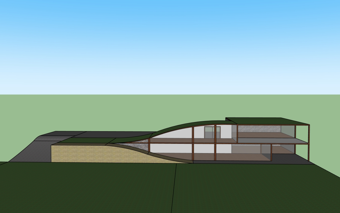 new urbanism exterior shot the building is between vineyards the building is stone with wood details the loof top is green grass with small trees architecture