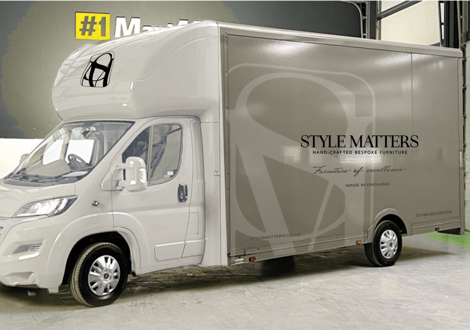 maxi mover van with white front carrier and back is wrapped in taupe oyster colour with black logos