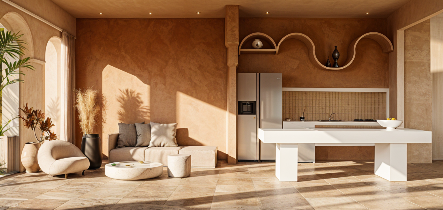 use perspective view and render to a modern ranch style interior use reference image as inspiration