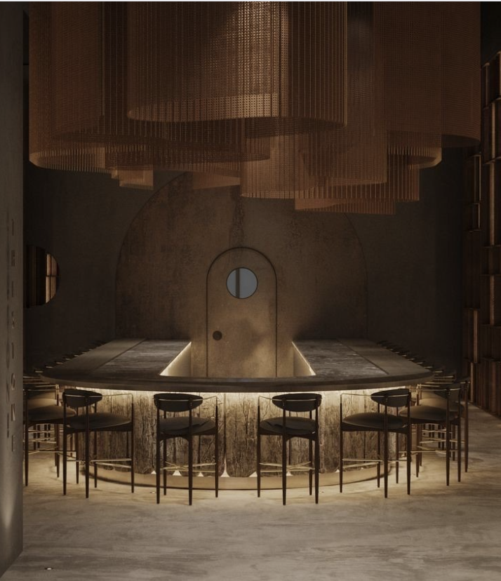 sustainable design interior shot make look more realistic make the chairs leather club chairs instead of a door put a wood cooking oven hyper real put dark floor boards on the floor architecture