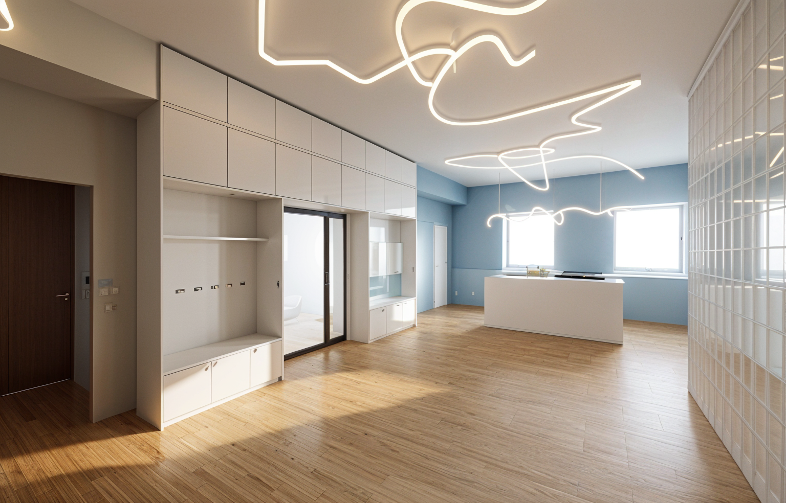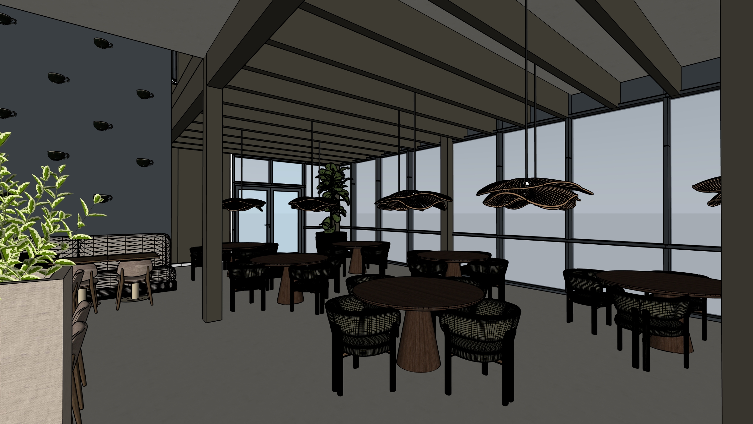a photorealistic 8k high resolution interior photograph captured in natural bright daylight based strictly on the current perspective and composition natural daylight floods in from the main grid glass partition creating a clean crisp and fresh daytime atmosphere sophisticated layered architectural lighting is soft and complementary there are absolutely no changes allowed to the design or proportions of the original wireframe structure ceiling beams the exposed ceiling beams and the ceiling structure are finished in a smooth matte little greene attic 2 dark charcoal green appearing distinct yet brightened by daylight lighting wall uplighters multiple rows of theecupjes teacups matching their positions in the current visual are custom wall mounted as uplighters casting a warm light pattern upwards against the matte attic 2 wall pendant lamps realistic rattan pendant lamps with their natural woven color and shape from the current visual are suspended by bronze rods over the main dining tables warm architectural strip lighting provides soft supplemental fill light furniture long booth background a long contiguous straight bench stretching across the background identical in shape to the current wireframe is upholstered in full grain textured light grey leather dux vintage fr light grey referencing image 47 png the leather must be distinct and light grey not dark distressed or fabric with detailed texture definition and sharply defined segmentation and seams two black pillows remain dining tables multiple round walnut dining tables referencing image 48 png remain exactly as positioned dining chairs the chairs arranged around the round tables have walnut wood frames and bases upholstered in a coarse tactile grey beige woven fabric fabb bjornn 77 referencing image 32 png accent chairs lounge chairs positioned near the straight bench are upholstered in smooth neutral taupe wool felt canyon taupe texture image 35 png rendered as smooth fabric planter box vegetation the integrated planter box on the far left is covered in a textile look wood laminate decolegno alpaca fd32 in a clear camel beige tone it is filled with feathery grasses clearly visible in daylight a large potted fiddle leaf fig tree is in the corner flooring the floor is a smooth clean gepolijst beton in a neutral gray tone background vista the view through the distant door reveals the beyond area consistent with the other rendered views natural daylight from the left must be dominant strict directive render the scene exactly as shown in the wireframe of the visual preserving all proportions and design elements but with a bright daytime atmosphere and photorealistic materiality and lighting omit all plants and trees except the feathery grasses