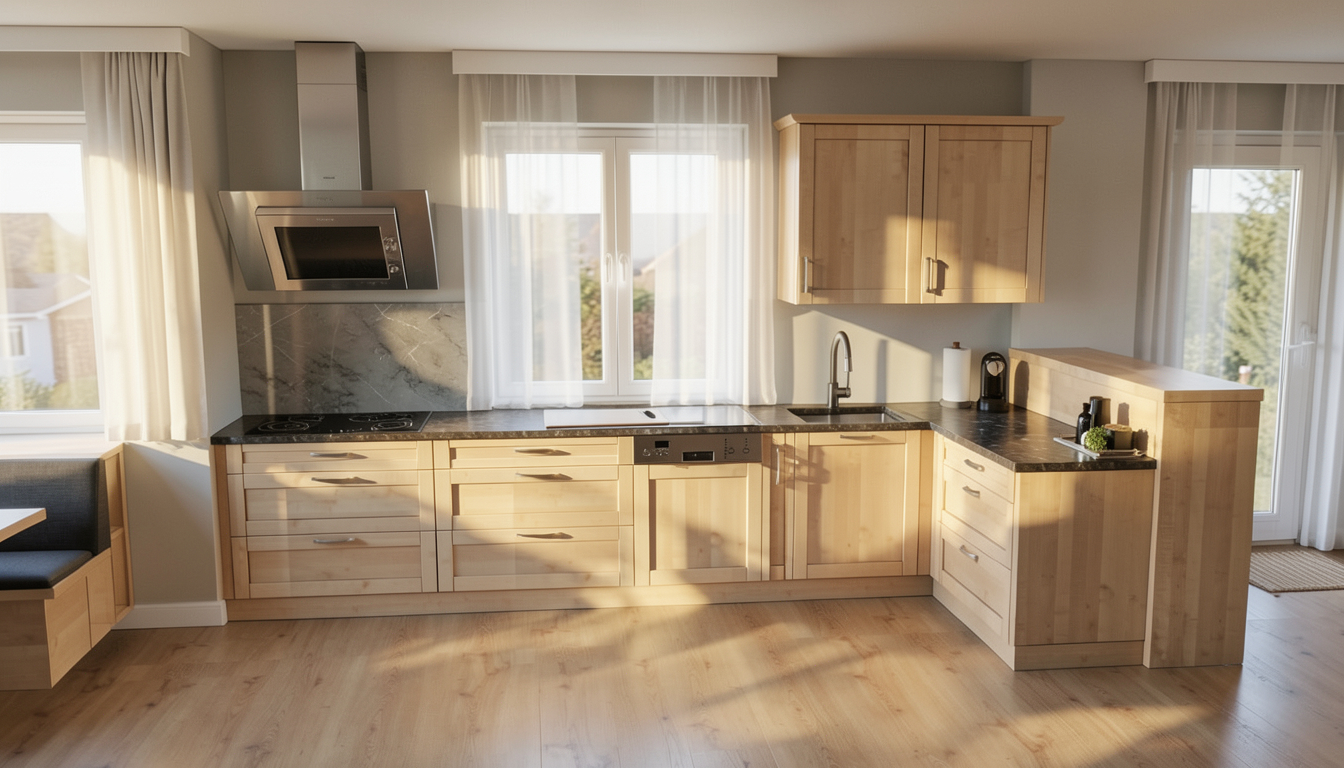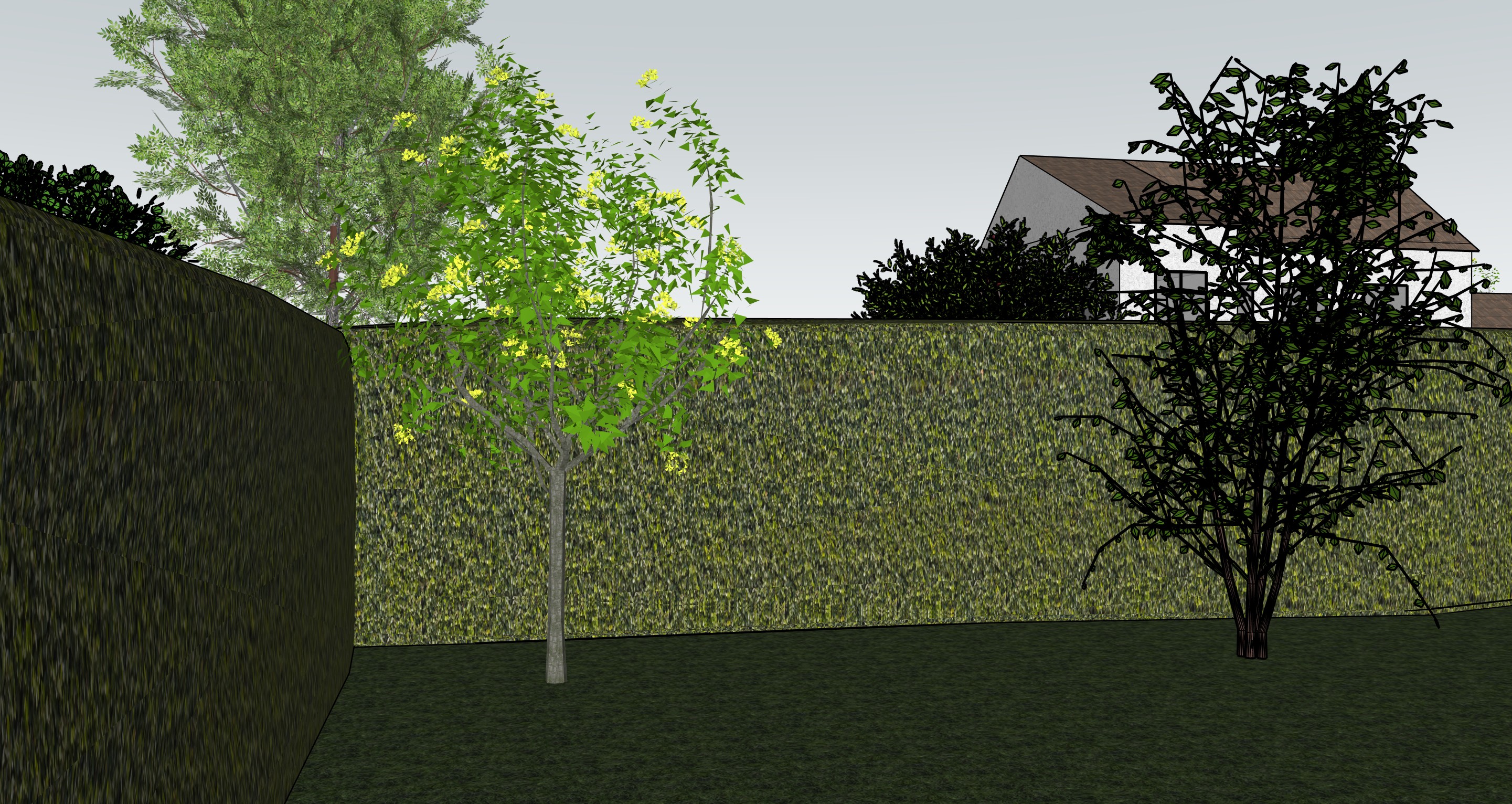 a modern architectural rendering depicts a row of three white townhouses with dark brown roofs each featuring large black garage doors on the ground floor and several windows on the upper levels to the left an a 3d rendered garden scene with a thick dark green hedge occupying the left side and extending across the background in the mid ground a slender tree with bright green leaves and small yellow flowers stands to the left of center its trunk a light gray to the right of center a darker more densely branched tree with sparse green leaves is positioned behind the hedge a section of a white house with a brown roof is visible in the upper right quadrant with dark green foliage surrounding it the ground is covered in a dark green textured lawn the perspective is eye level looking across the garden the lighting is neutral suggesting an overcast day the style is that of a digital architectural visualization or a video game environment with clean lines and distinct geometric shapes