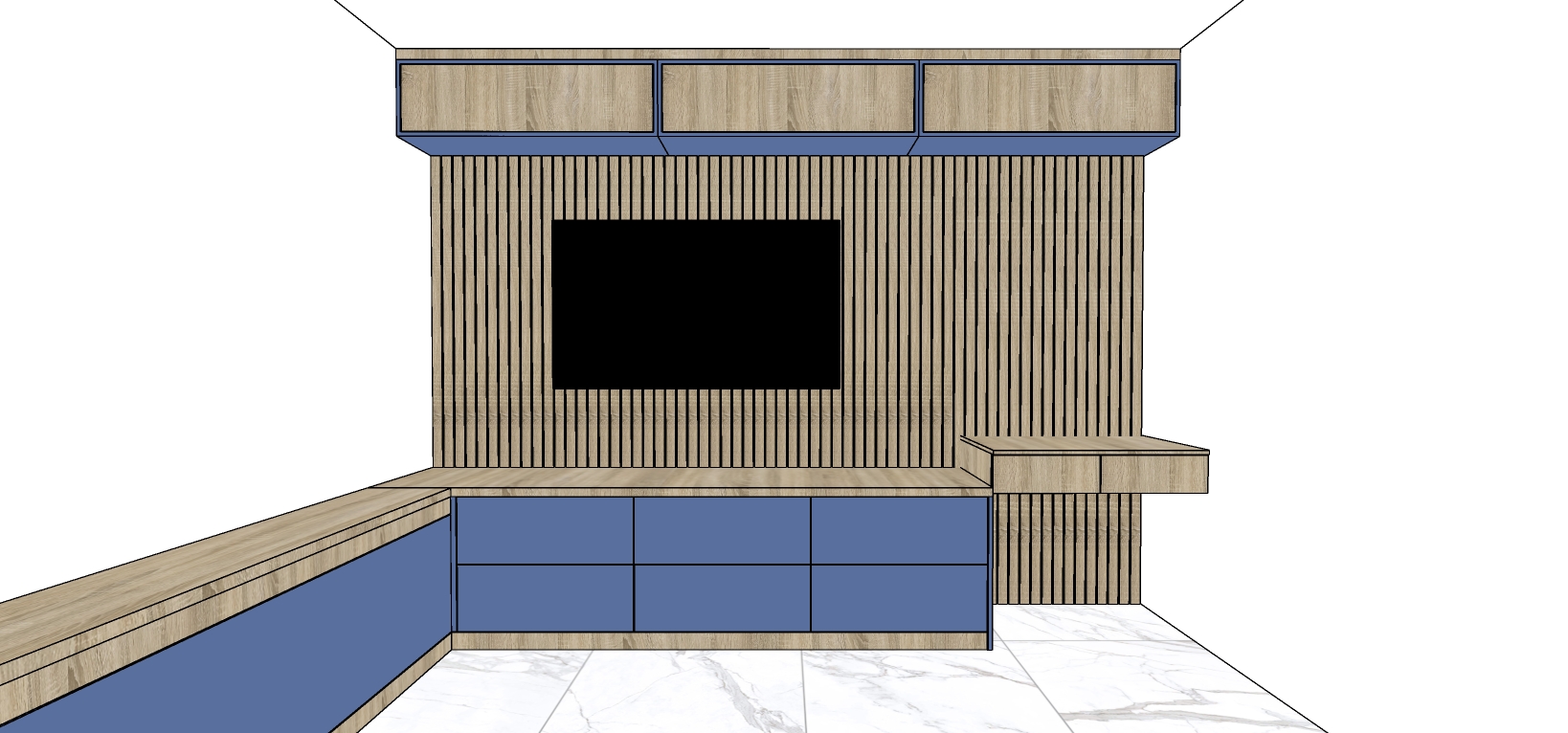 photorealistic modern interior render based on the provided sketchup design maintain the exact layout and proportions of the furniture and wall panels the space features a modern wood slat tv wall with vertical wooden slats the wood tone should be slightly lighter natural oak soft and warm but not too pale the lower cabinets remain matte blue the floor should be glossy polished porcelain marble tiles with subtle reflections add warm recessed ceiling lighting warm white 3000k illuminating the space evenly under the upper cabinets add a warm led strip light creating a soft glow on the wood slat wall the black rectangle in the center should become a modern flat screen tv displaying the netflix home screen interface on the right side where the desk area is located place a simple modern chair with light upholstery add minimal modern decor on the cabinets such as small plants books and a sculptural decorative object lighting should be warm and cozy cinematic interior lighting realistic shadows and reflections ultra realistic interior photography 4k architectural visualization soft global illumination professional interior design render