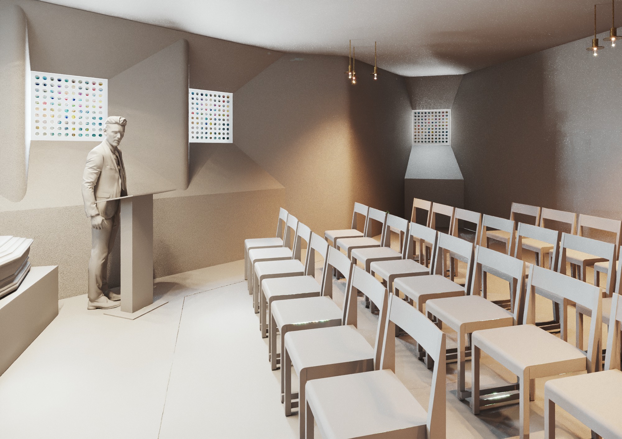 ceci est l image d un fun rarium il faut le coloriser les murs sont en cr pi la chaux gris beige clair le sol est en marbre blanc de carrare le plafond est blanc le cercueil tout gauche est en bois avec une gerbe de fleur dessus et une couronne mortuaire le socle du cercueil est en marbre blanc et gris le cercueil et le socle doivent rester leur place des personnes en deuil sont assis sur les chaises et coutent l orateur debout derri re le pupitre la lumi re est tamis e