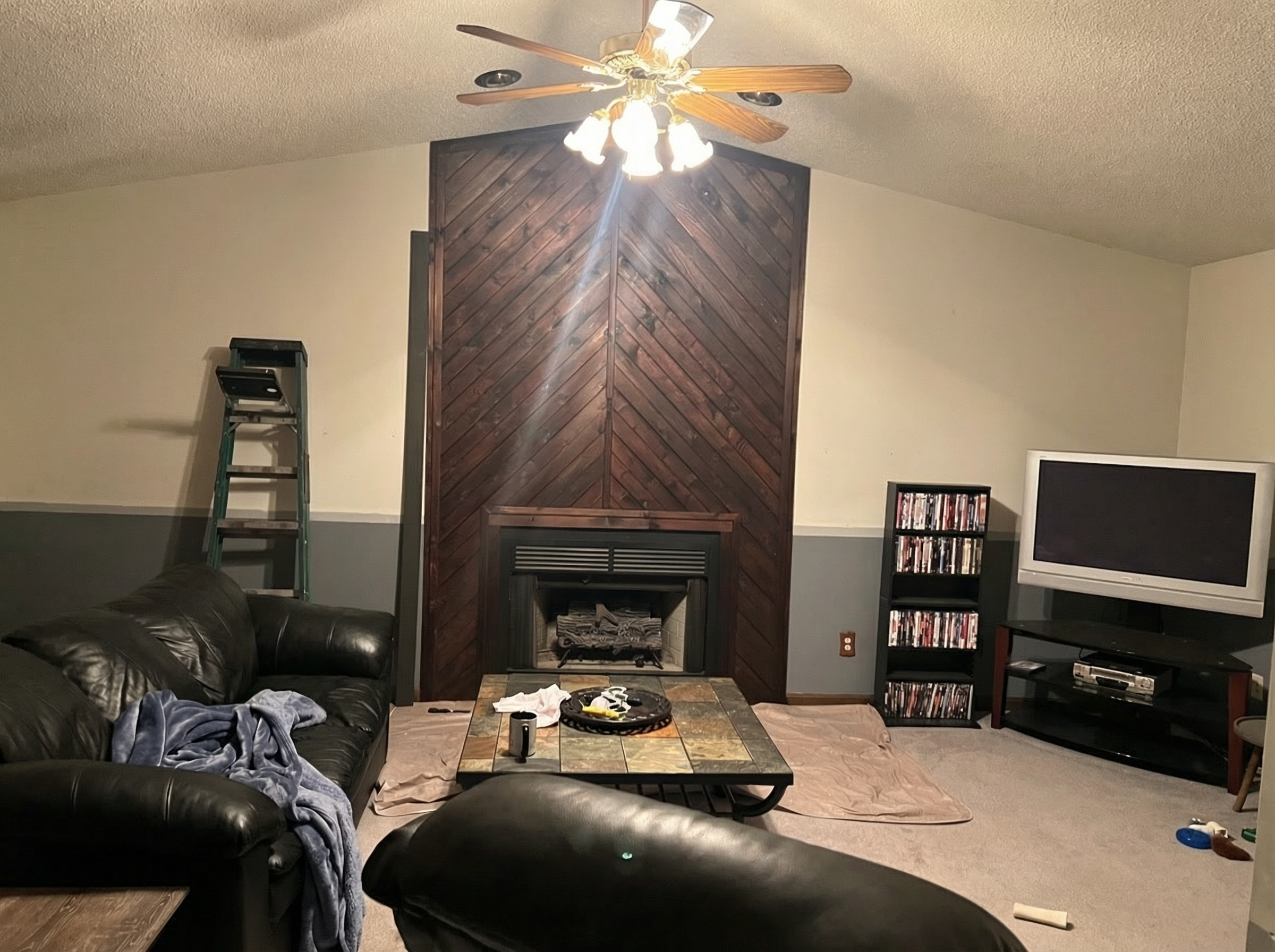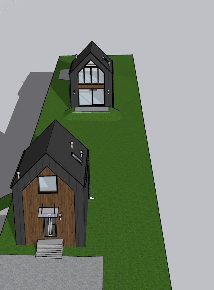 metal dark roof wooden walls dark plaster dark windows and door courtins in windows low bushes and flowers chimney covered with dark sheet metal