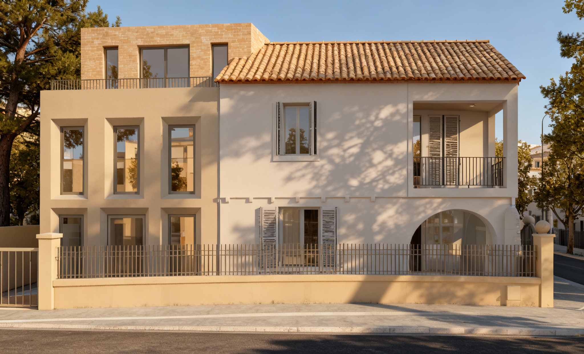 lot of reflects and sun light the sun illuminates the facade that we see some trees and a street of marseille in the backgroung facade more in the light more reflect all is painted no stone the fence call is beige like the extension more shadows of trees on the facade my point of view the fence and the building on the left are same color the attic is in little beige bricks more realistic view hyperralis