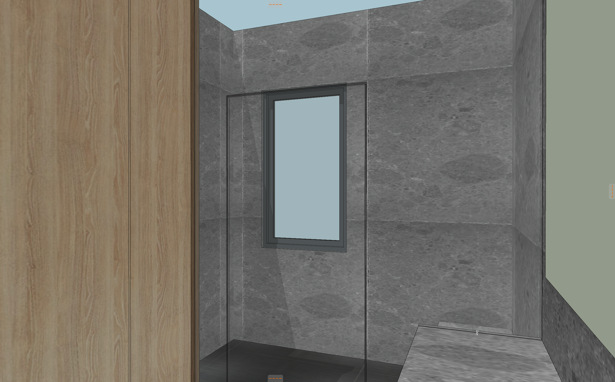 white oak cabinets black ribbon tile floor with a sheep skin rug on the floor medium dark grey marble backsplash wall with a medium amount of veining wood ceiling
