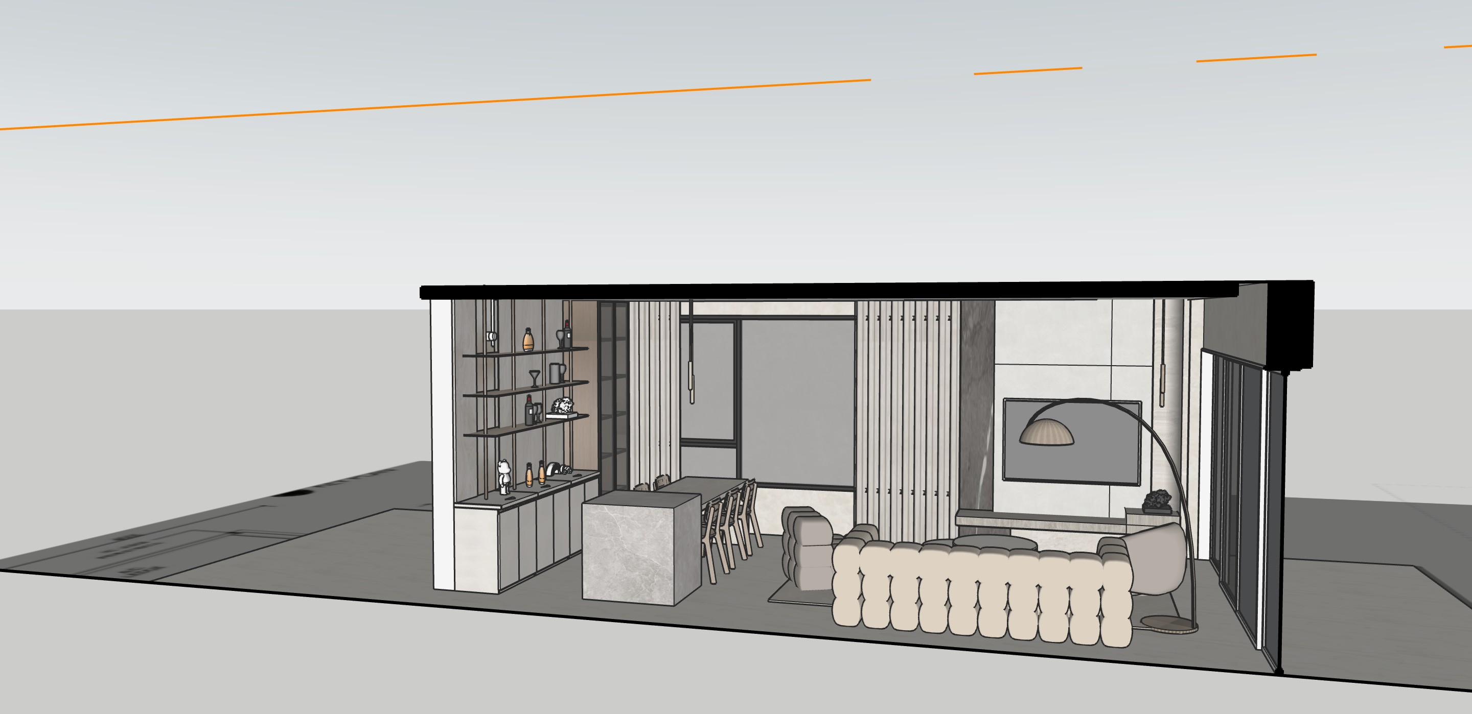 this is a condo unit we would like to render it into 3d preserving its colours make the island counter light grey marble window area to be light grey curtain suede soft nude sofa and aluminium bronze open shelf and glass display cabinet use light grey wood for tv console
