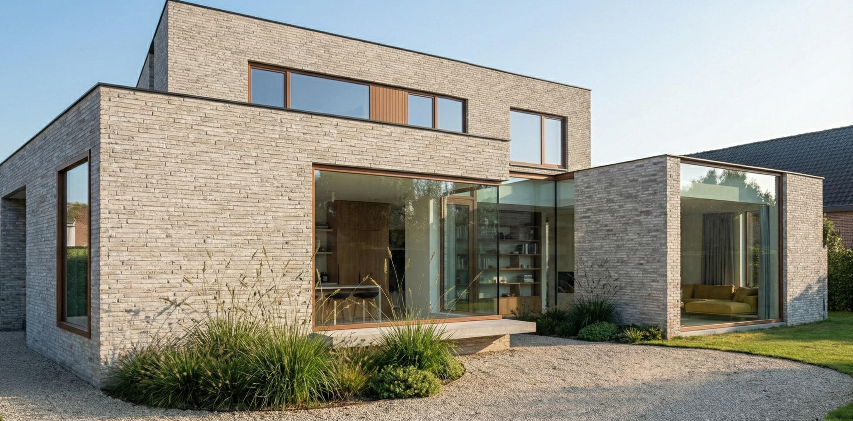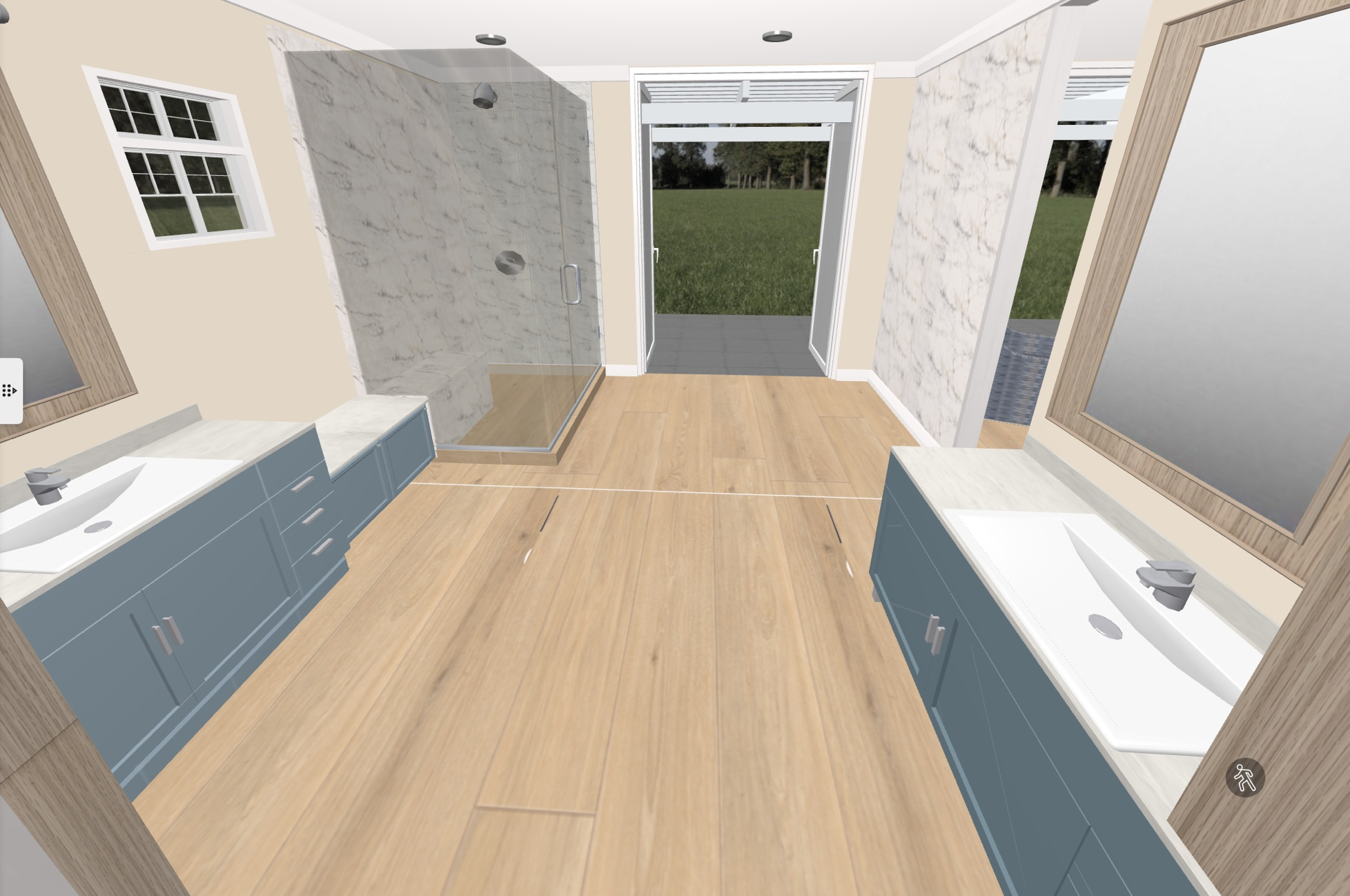 this modern elegant ensuite is flanked in natural sunlight the warm oak tile floors that run seamlessly into the shower are offset by the luminous large format porcelain tile on the shower walls and repeated on the wall opposite the shower the blue in the porcelain tile plays off the blue in the cabinetry the shower bench and brushed nickel fixtures add sophistication and elegance in the space the backlit oak framed mirrors and vanity light add an added dimension of warm light while the warm neutral quartz on the vanities and window bench add a cohesive element of warmth