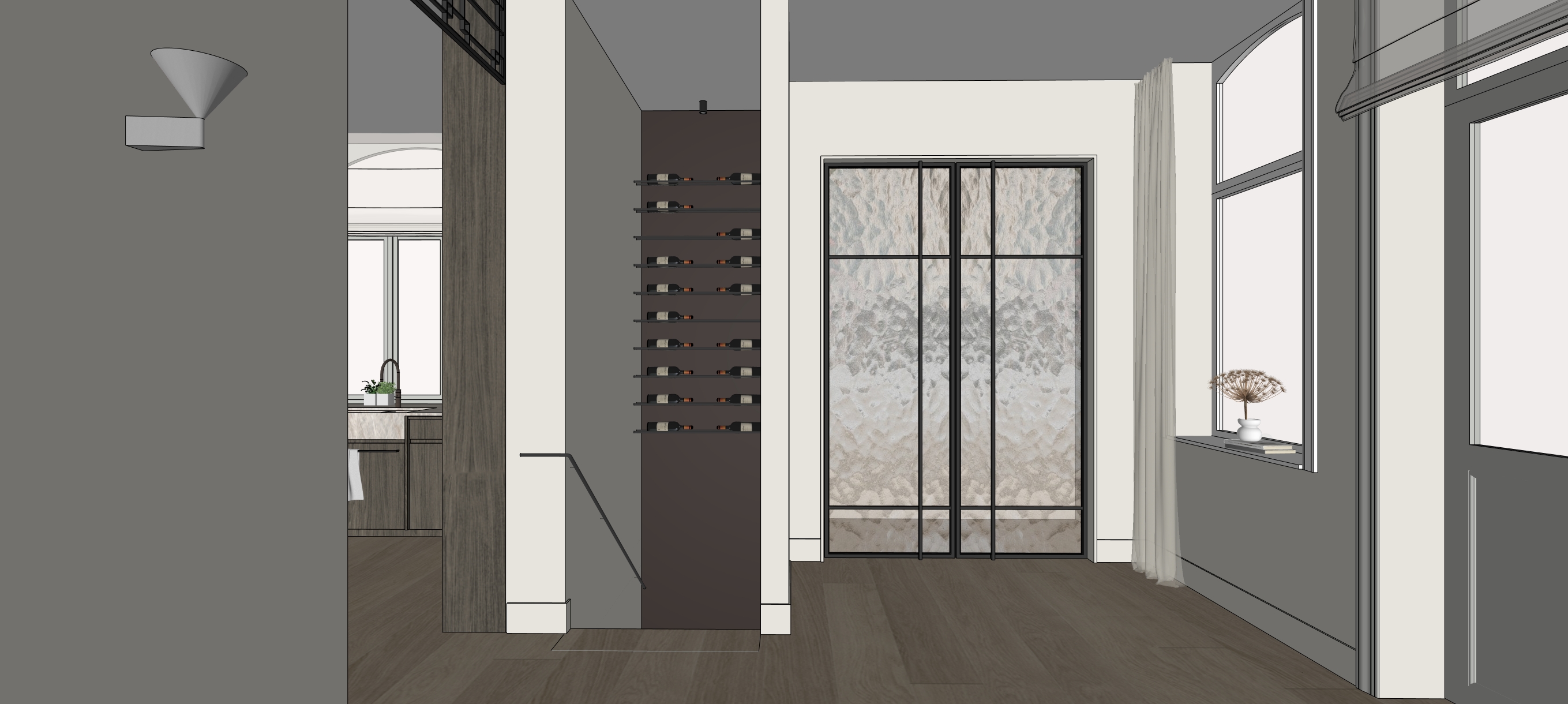 make the sketchup interior photorealistic refine the cathedral glass texture in the sliding doors make the glass pattern significantly finer and more delicate with subtle irregularities and small scale distortion the glass should feel elegant and high end with softly diffused light shallow texture depth and a realistic frosted cathedral glass appearance maintain sharp thin black metal frames and the existing door proportions the glass should appear refined calm and architecturally realistic not decorative or exaggerated