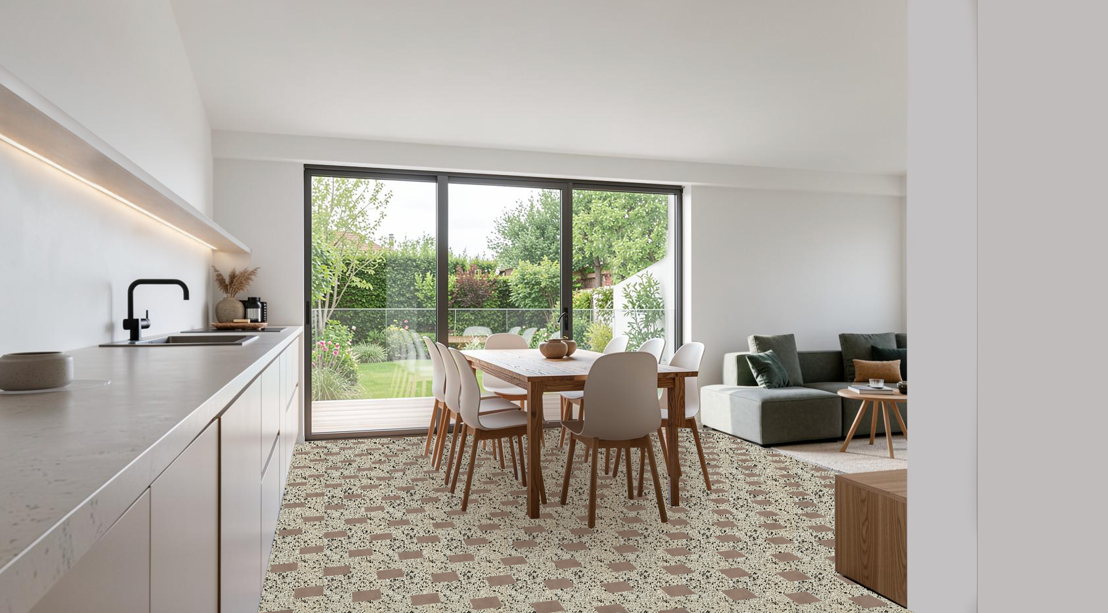 enhance the image add some plants on the shelf on the left add a chandelier