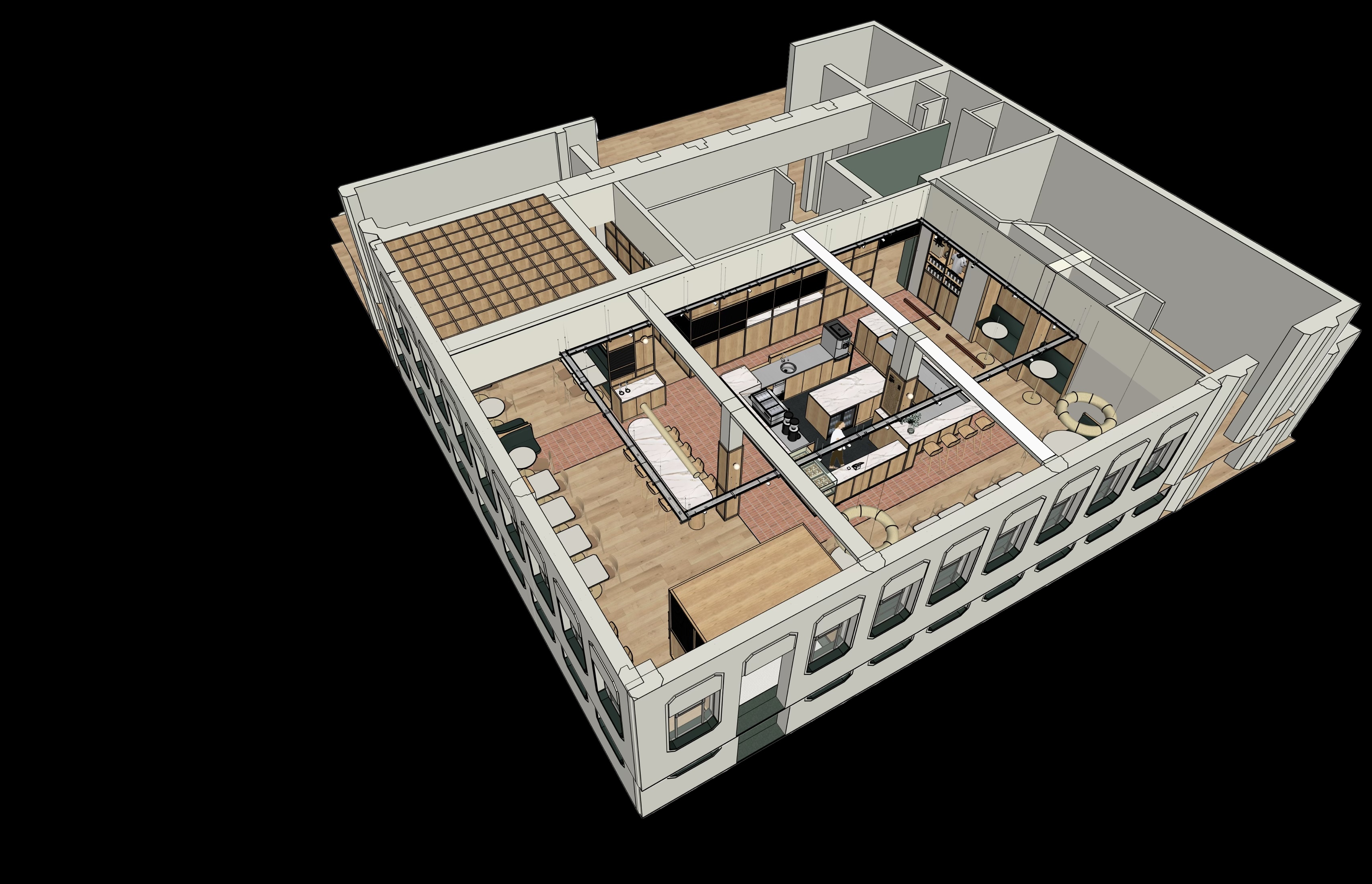 using the style of the last hand sketch created render the attached axo create a loose handsketch with colour in the enter and black white towards teh edge not too much detaill