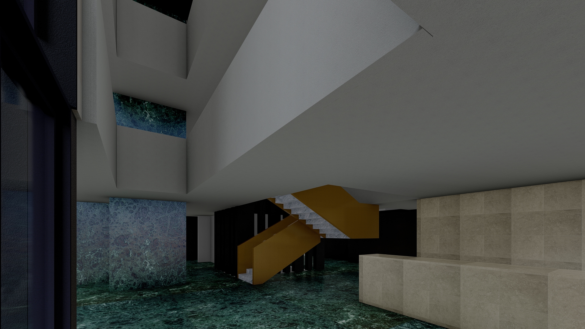 this is an image of a reception the yellow stone is a reception counter and a stone clad wall behind it add more lights leave the space in front of reception more open the yellow is a metallic cladding the green is a veined green marble no sofas in the middle place some people in the middle