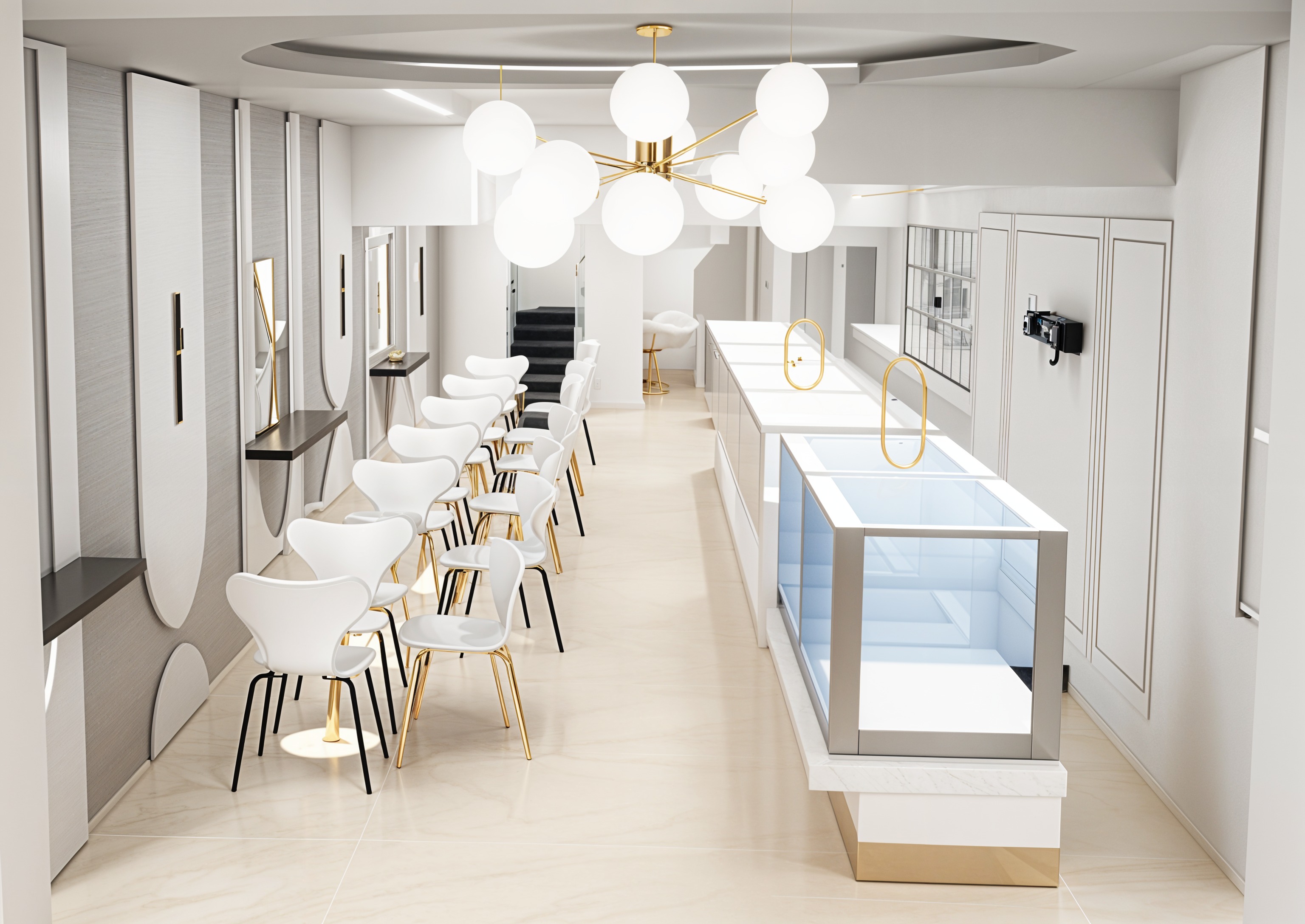 interior shot modern luxury bakery sleek architectural design with sharp clean lines structure painted in neutral tones light beige and dark charcoal creating contrast large glass windows reflecting soft blue sky bright green palm tree on the left with lush foliage driveway with smooth stone steps leading up light gray pavement three luxury cars parked in the garage vibrant red classic maroon and glossy black soft evening light casting gentle shadows creating a calm and inviting ambiance