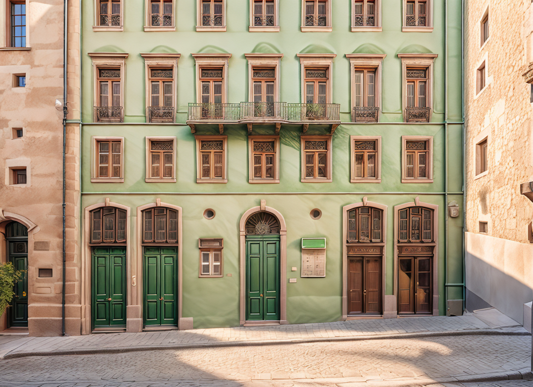 add water in the top left part of the picture river shore ad brick texture to all the facades of the buildings dont chane anything os the rooftops