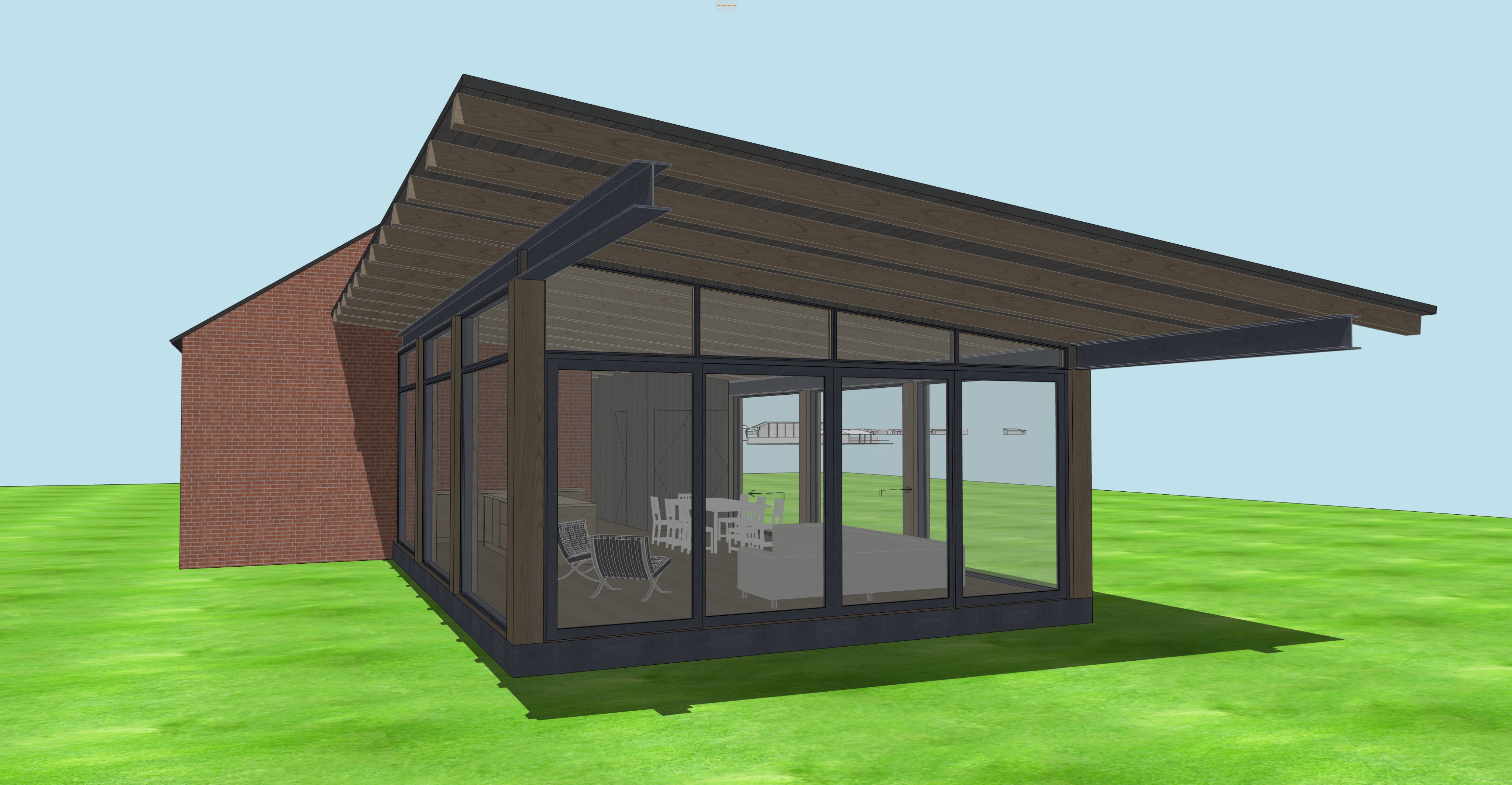 antique brick with metal roof and steel beam and timber beams the fields should be tall native grasses with sparsely populated cypress trees on the shoreline continue the water into the horizon