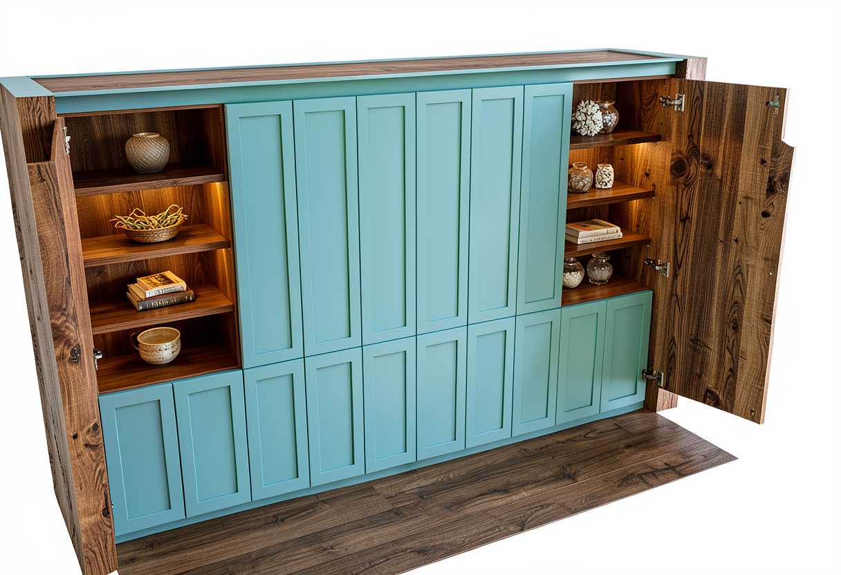 please make the open cabinets on the sides with walnut interiors place a few decorative items on the shelves the walnut pieces on the sides should be walls not part of the furniture piece change the white doors to a the same color as the phildelphia eagles blue green color
