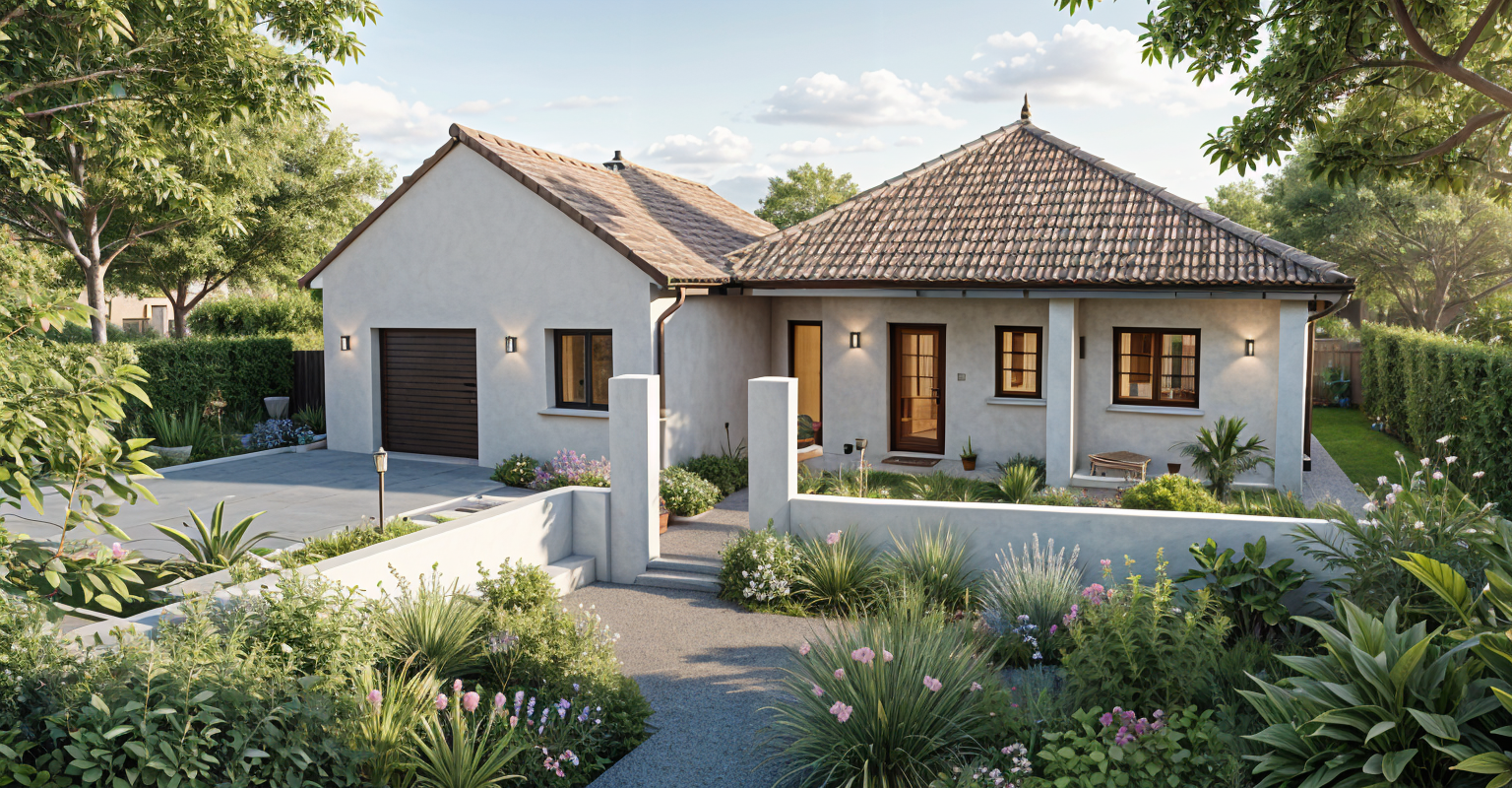 faire un rendu photo r aliste beaucoup de verdure autour de la maison sauf devant la cl ture fen tre porte gris anthracite toiture tuile m canique brune belle apr s midi de juillet ensoleill