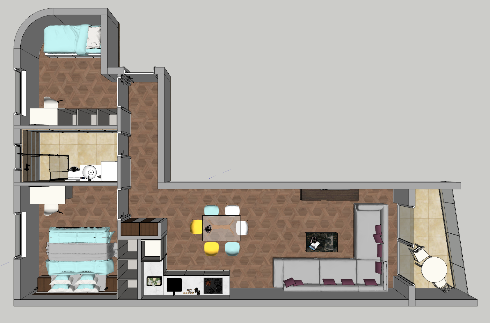 top down interior render of a modern flat re rendered from an existing layout orthographic view precise furniture placement realistic materials soft natural lighting high detail clean composition architectural visualization 4k global illumination