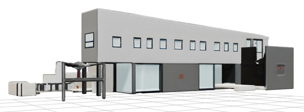 the house will be white with black woodwork the entrance is directly to the right a light blue suzuki suv will be parked in the garden the vegetation will be subtropical with palm trees some flowers and cacti a lawn and some people having a family barbecue with children the windows will be mirrored reflecting the exterior it is daytime and the light is sunny it rained last night and the exterior is still wet there are detached houses on neighboring plots