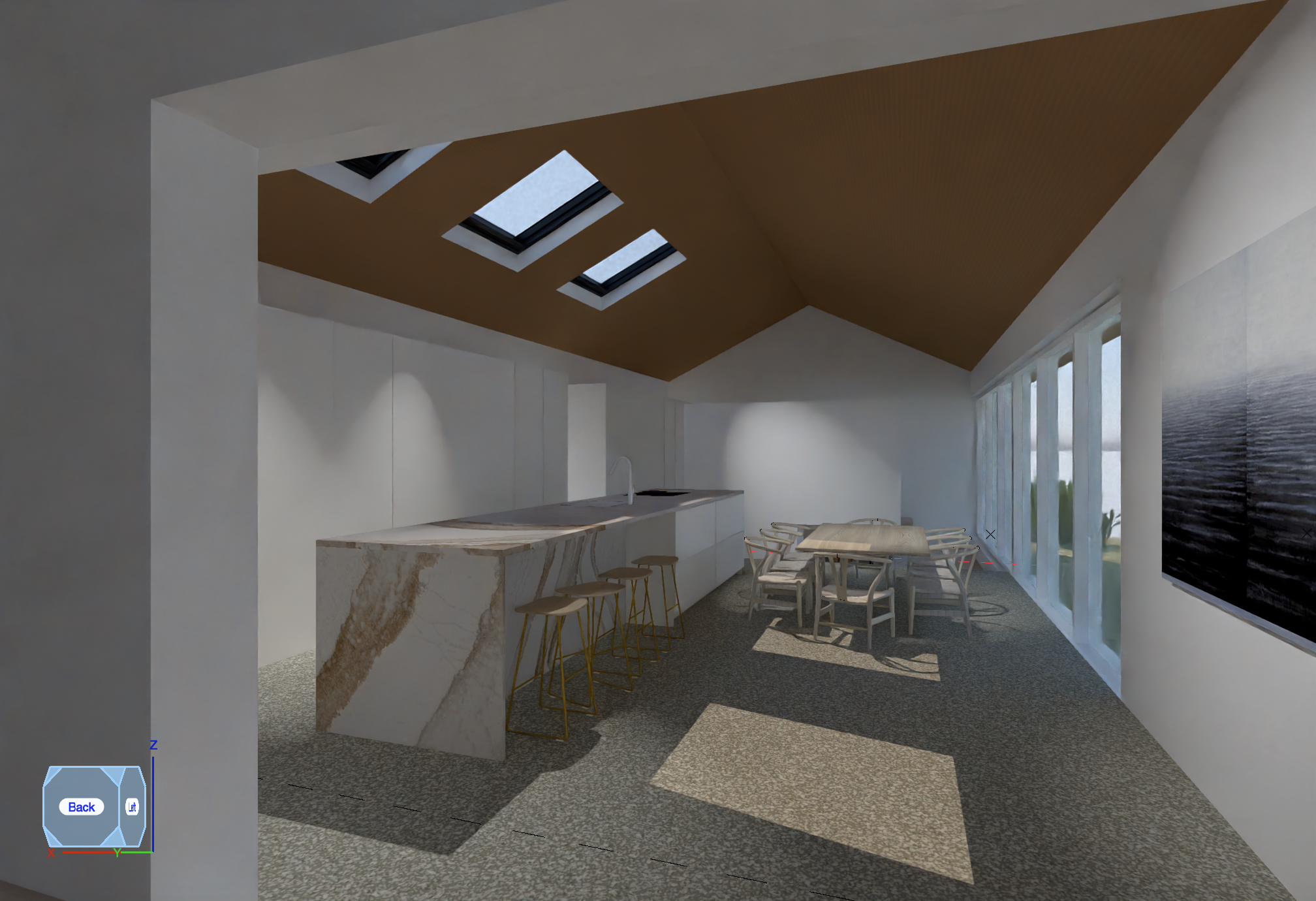minimalism interior shot render a modern kitchen dining space with high vaulted ceilings featuring three skylights the walls are smooth and painted in a soft warm white creating a serene backdrop the slanted ceiling is a rich wood shade adding warmth and depth the countertop is elegant adorned with a polished marble texture of cream and subtle brown veins paired with sleek modern bar stools with golden legs and natural wood tops the dining area features a light oak wooden table surrounded by matching chairs for a cohesive minimalist look large windows on one side let natural soft daylight pour in highlighting the light gray stone flooring with its subtle texture the atmosphere is calm and inviting a perfect blend of elegance and understated luxury architecture