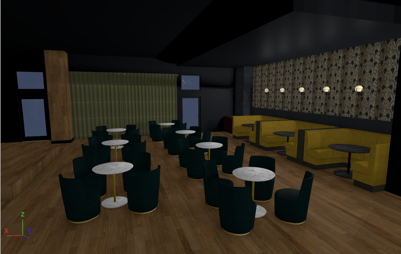 a cozy elegant lounge with a warm and inviting atmosphere golden velvet booths with channeled backs curve around tables contrasted by deep green armchairs the tables feature white marble tops and gold legs adding a touch of luxury the wooden floor has a dark herringbone pattern complemented by textured black and gold patterned wallpaper soft ambient lighting comes from the wall and above casting gentle glows on each surface creating a sophisticated and welcoming environment luxurious velvet drapery covers the large window