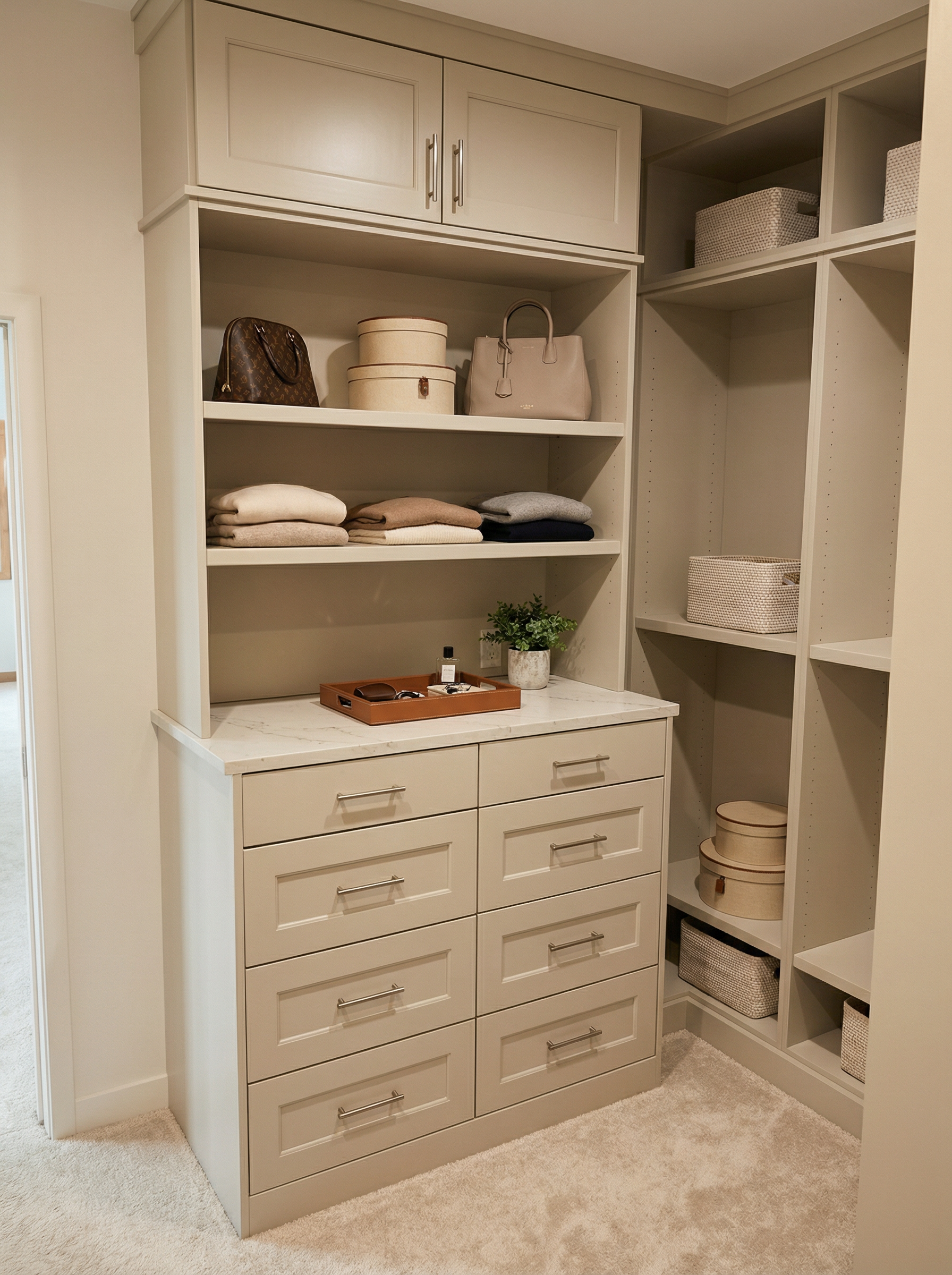 countertops to be a violetta calacatta marble stone pendants to be brass and white cabinetry to be a mushroom colored paint finish arched doors as dark wood and glass ceiling beam as black wood island wood as dark brown wood