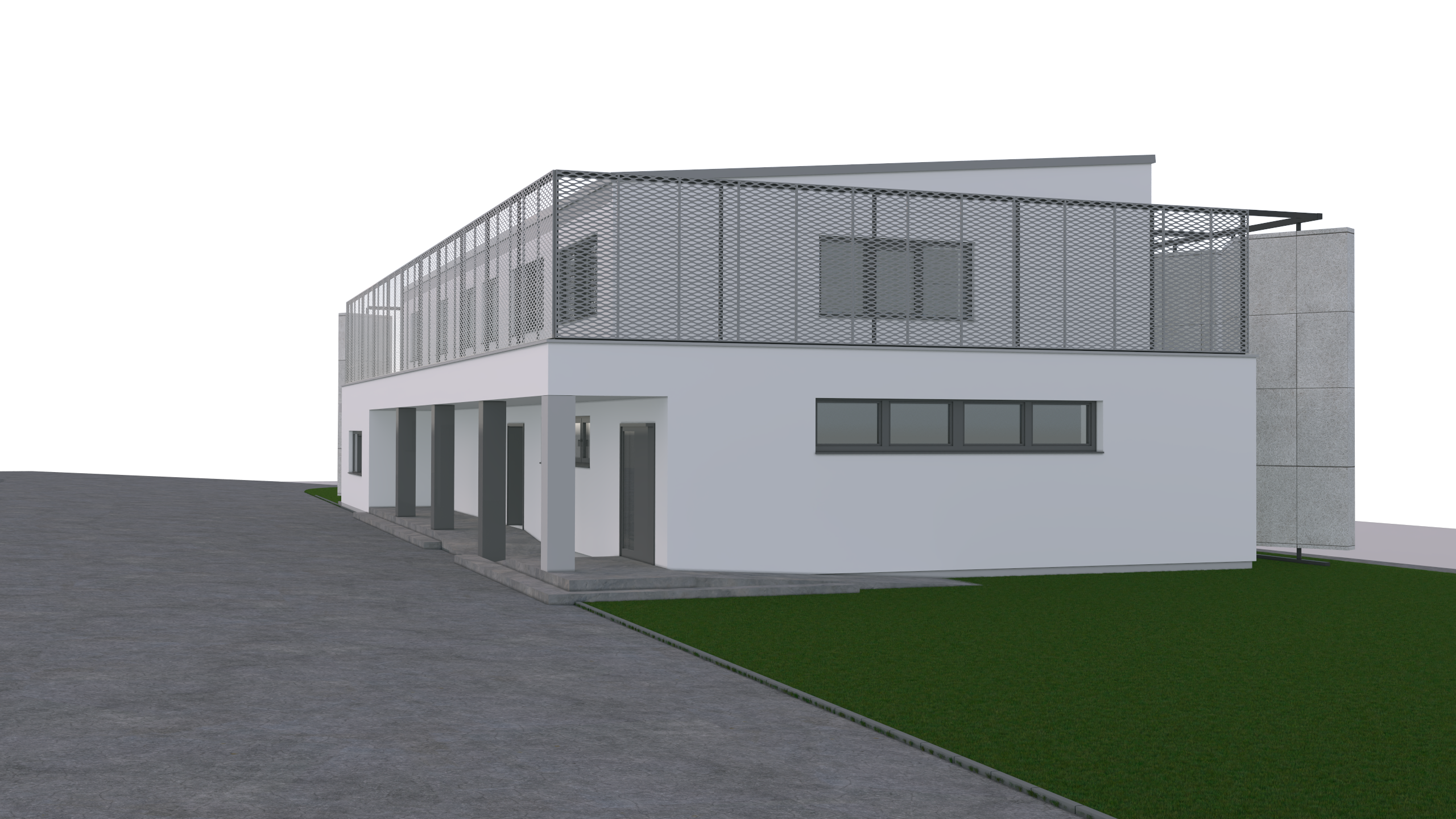 modernist exterior shot modern architectural building surrounded by a lush vibrant green lawn a sleek white facade and dark tinted windows the metal mesh railing is silver with intricate patterns giving an industrial yet elegant look the pavement is a smooth rich gray complementing the white and silver elements the overall atmosphere is serene and sophisticated with soft natural lighting casting subtle shadows offering a minimalist and contemporary aesthetic sunny day with soft lights and shadows architecture