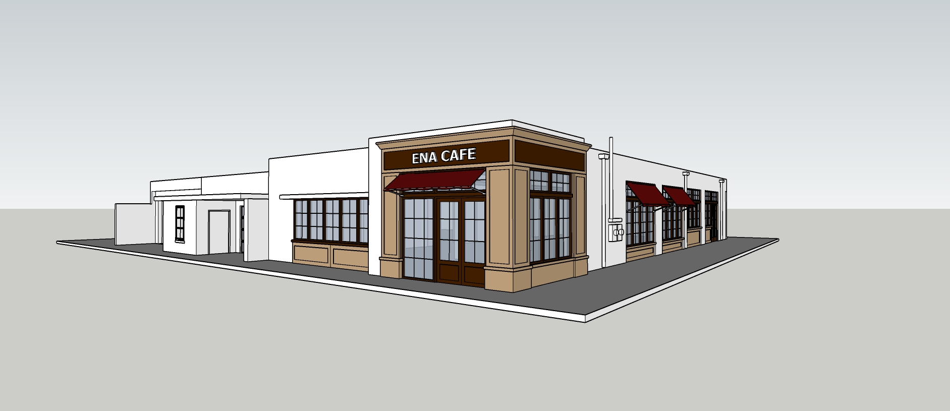 morning lighting european vibe pastry and coffee bar add potted plants outside bistro tables with people enjoying coffee and pastries against the building weathered building south florida