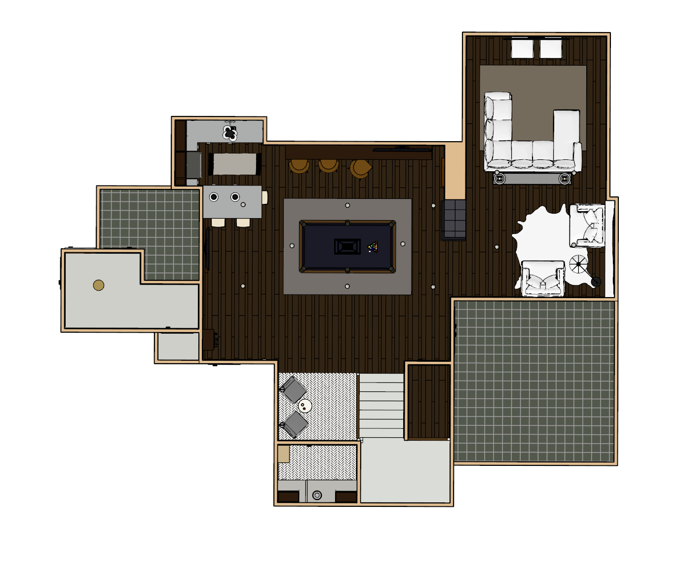basement floorplan overview with recessed lighting dark wood flooring and herringbone tile in the alcove next to the steps