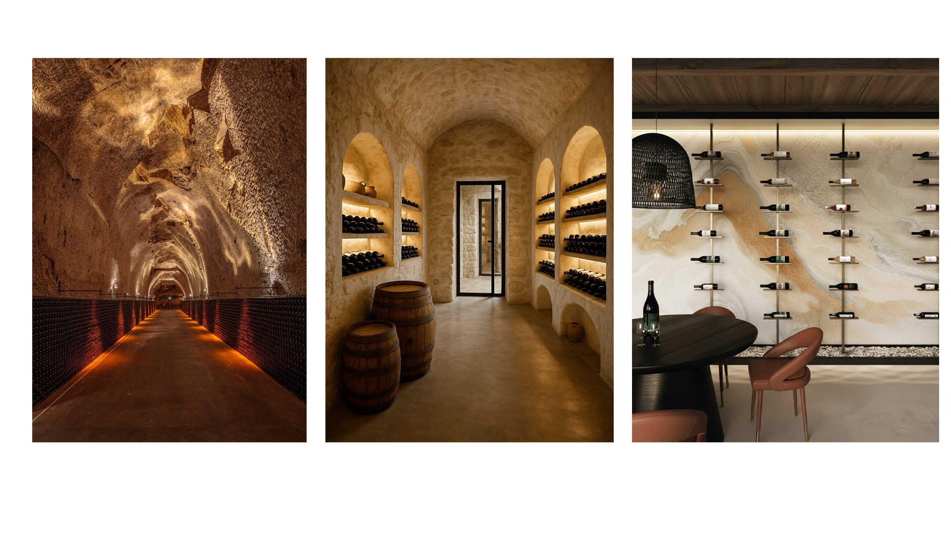 exterior shot interior shot of a contemporary wine cellar with a refined minimalist architectural design create a high end photorealistic render while preserving the exact spatial layout arches wall geometry shelving niches and proportions of the original design the walls are finished with warm beige lime plaster lime plaster finish with subtle mineral texture and soft matte depth the floor is made of beige grey polished concrete waxed concrete with a smooth surface and very subtle reflections at the back of the space include a natural stone feature wall made of irregular warm beige limestone stones at the base of this wall add a recessed strip filled with small decorative pebbles a concealed led strip runs along the base creating soft indirect uplighting that washes the stone wall and emphasizes the texture of the stones inside each architectural niche integrate warm concealed led backlighting that creates a soft halo glow within the arches place elegant wine bottles inside the niches arranged in a refined and balanced composition lighting should feel atmospheric and sophisticated similar to high end winery interiors use warm indirect lighting soft shadows subtle reflections on glass bottles and gentle highlights on the lime plaster walls and polished concrete floor the overall mood should be calm elegant and architectural with cinematic depth realistic materials and premium architectural visualization quality