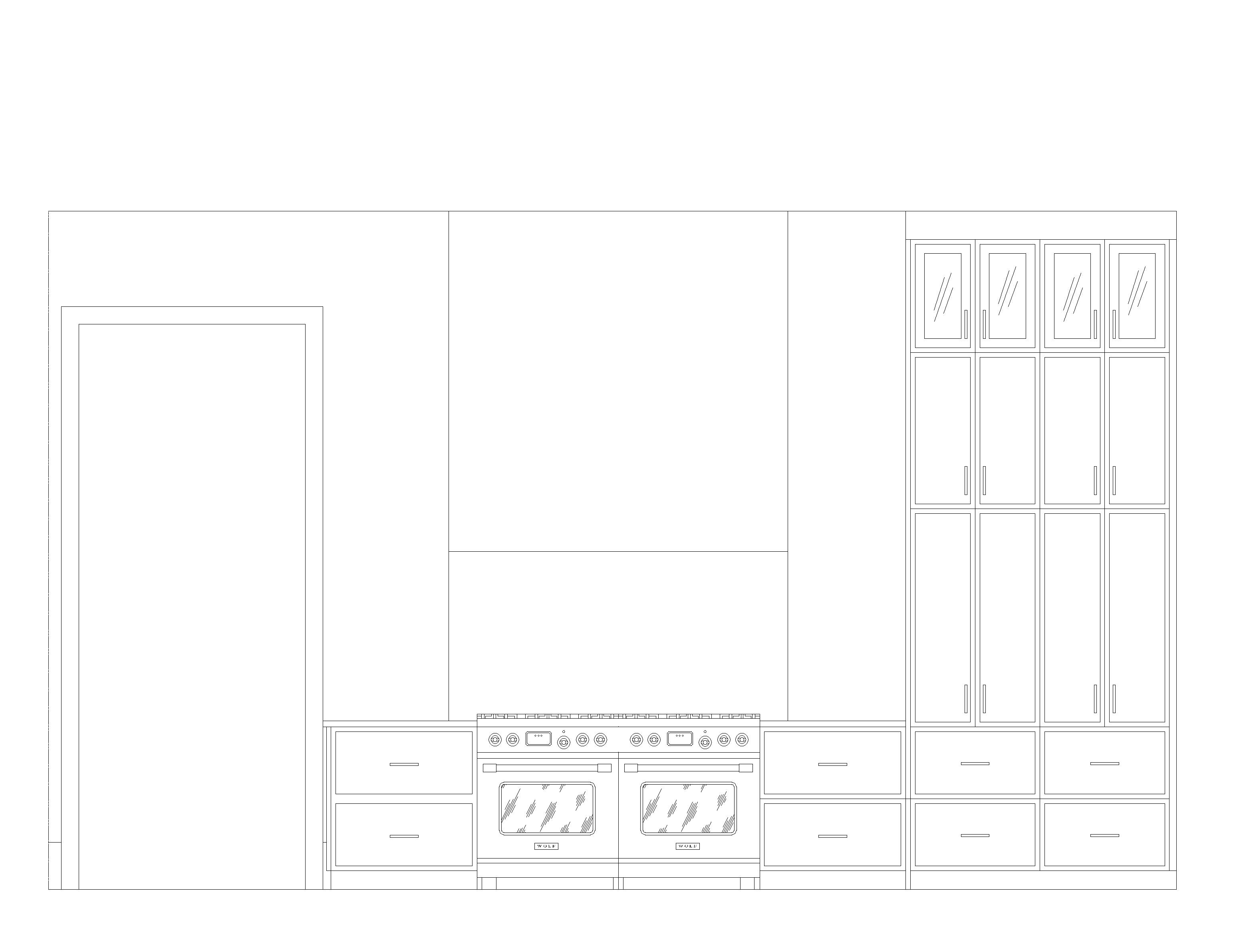 render in perspective with off white cabinetry range is wolf df6065dgsp hood is stucco backsplash below hood is white carrara marble