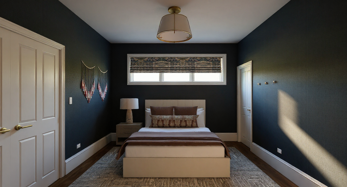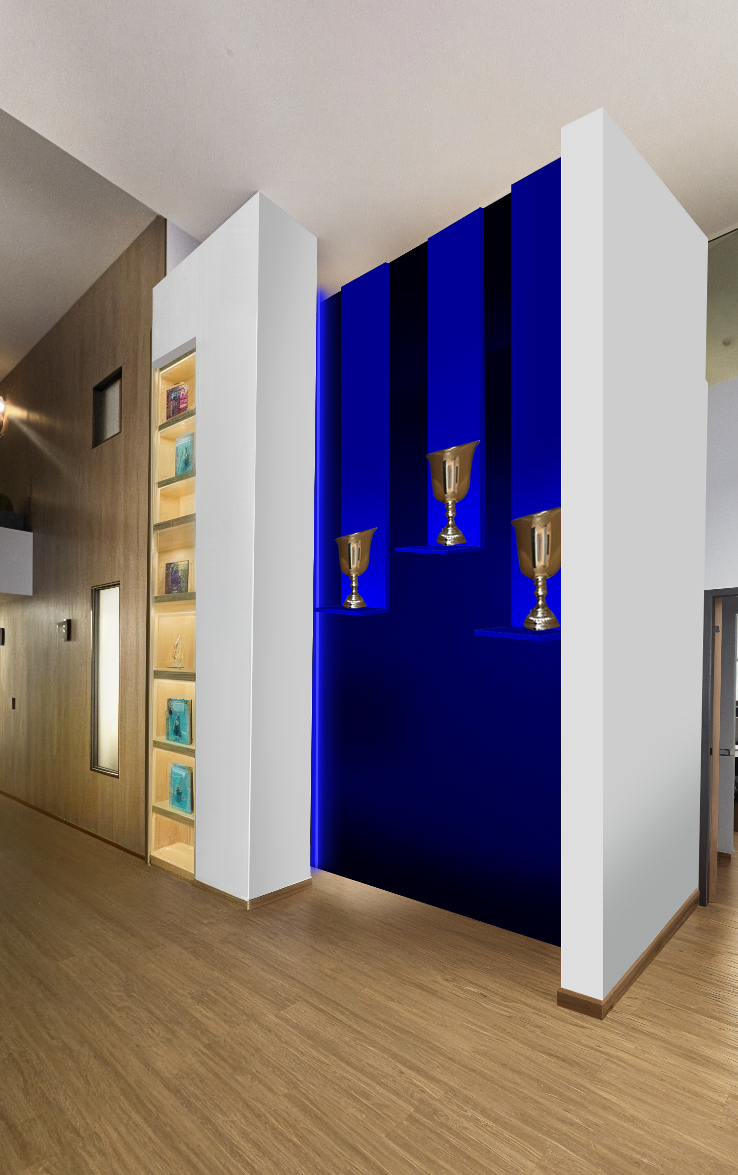 create a modern elegant interior scene featuring a large navy blue display shelf with soft white led lighting on each level place a golden trophy prominently on the shelves the surrounding walls should be a soft white providing contrast include a feature wall with sleek dark wood paneling to the left adorned with a display of colorful swimming covers use warm natural wood for the flooring to enhance the cozy yet sophisticated atmosphere the lighting should be ambient and inviting highlighting the textures and colors in the room