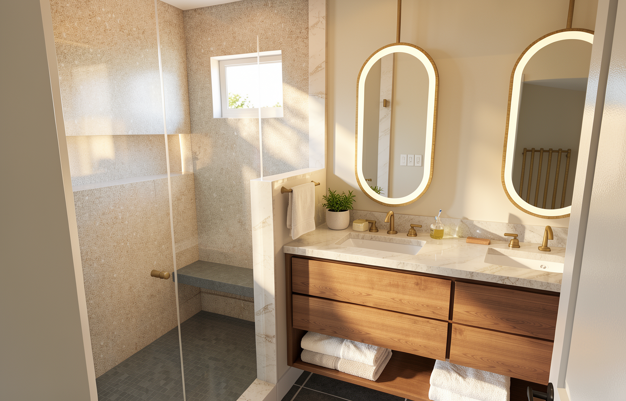 remove the 2 bottles on the half wall in the center of the room keep all of the other toiletries the exact same remove all lighting except the original window in the shower