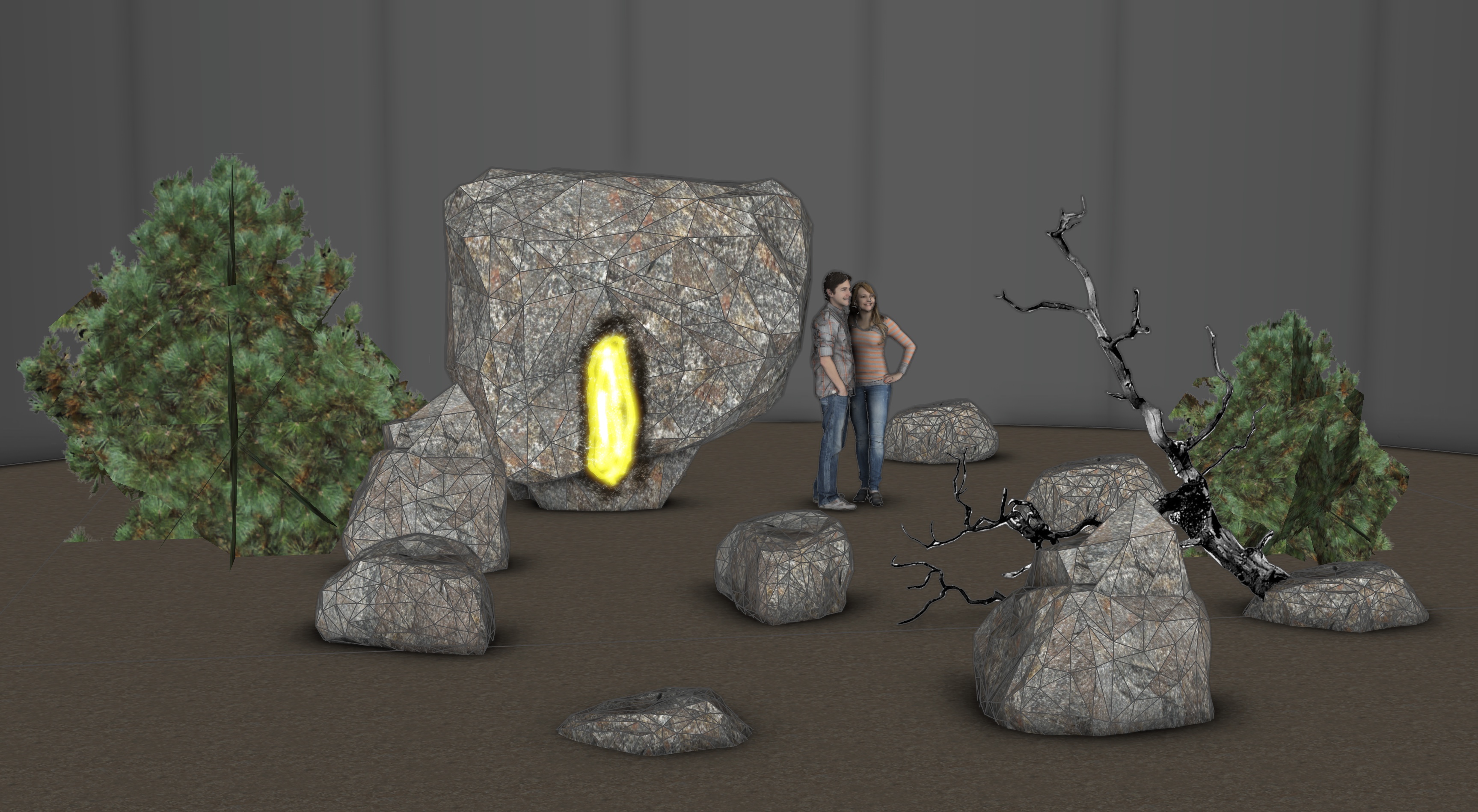 small opening in the rock with light coming out make rocks with softer edges night city scape in background