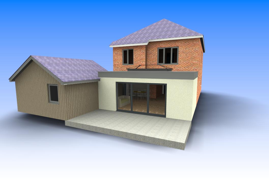 add moderist landscaping add external lighting to the flat roof extension make it photorealistic
